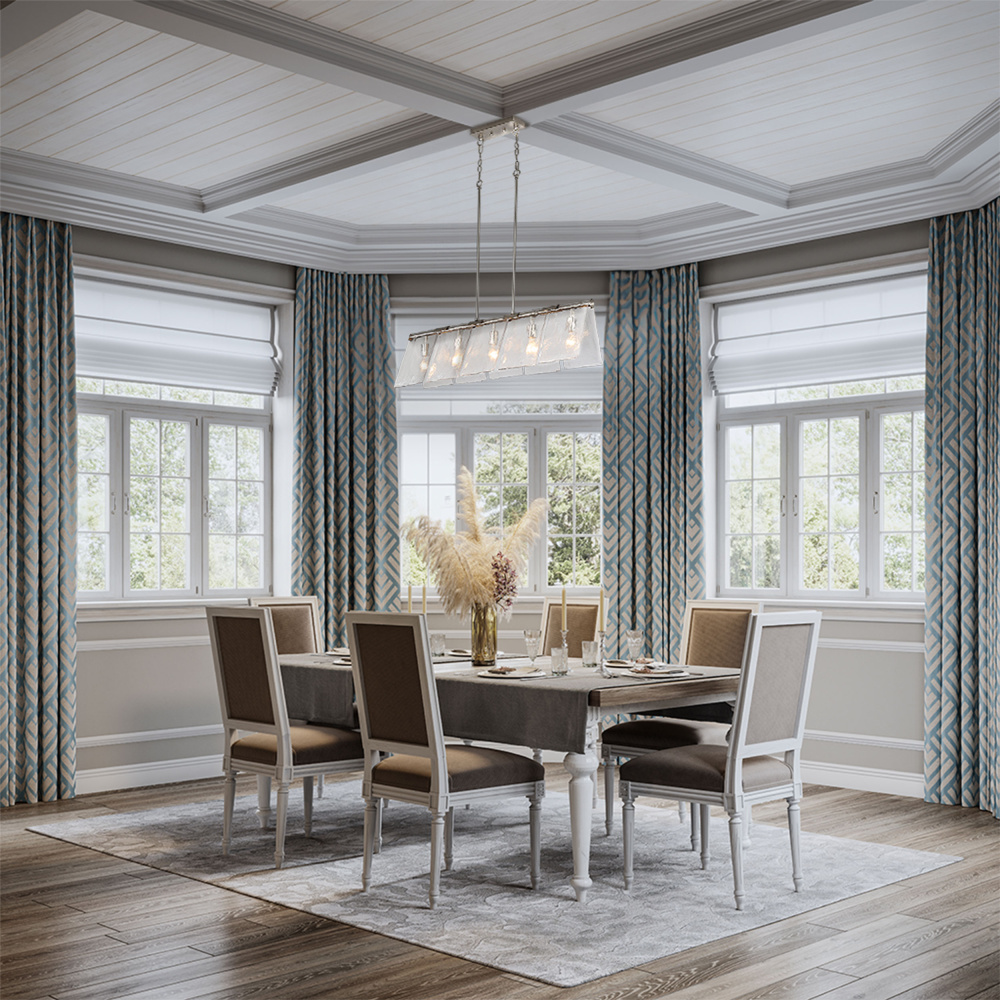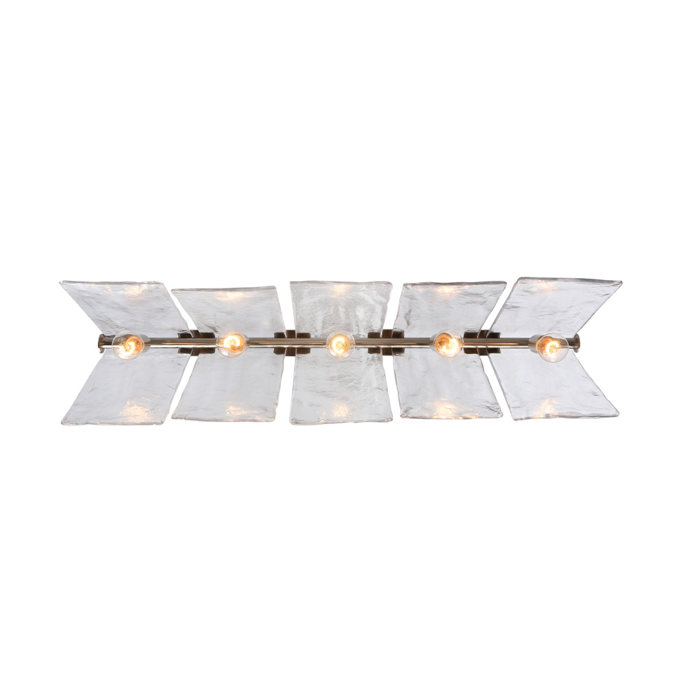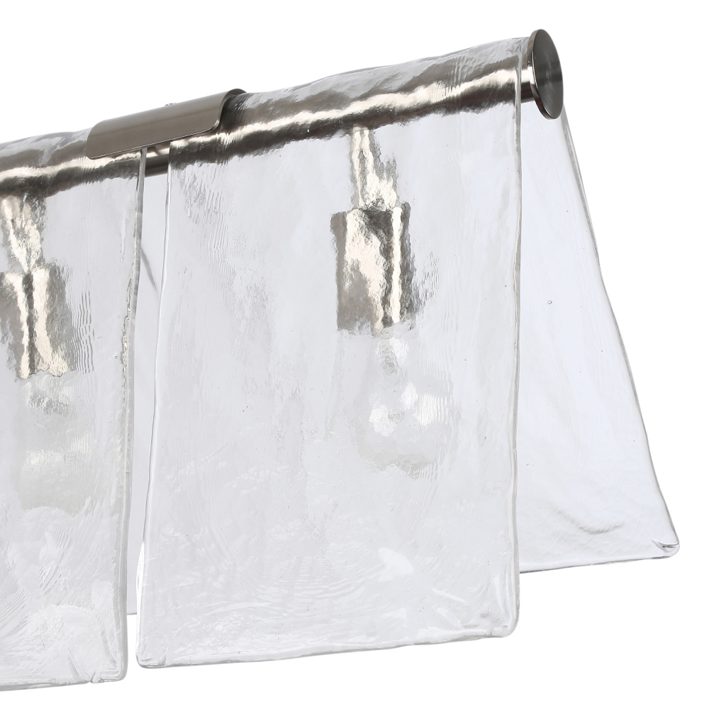Enrich your interior with the Golden Lighting Serenity 5-light Island Light in Pewter. Featuring a glass shade and a pewter frame, this fixture brings a soft, classic elegance into your home. The hammered water glass shade showcases an irregular texture that refracts light beautifully, creating an enchanting atmosphere. The pewter finish offers a medium-grey hue with subtle warmth, enhancing the charm of both classic and contemporary interiors. Designed for kitchen islands, it is dry location rated, perfect for living areas or hallways without moisture exposure. With sloped-ceiling compatibility and adjustable height from 16.375" to 57.75", it can be tailored to fit various spaces. The overall dimensions are 37.88"W x 10.38"H x 10.13"D, and it requires 5 E26 medium base bulbs (not included), max 60 wattage per bulb. Experience artisan quality and sophistication with this stunning light fixture.