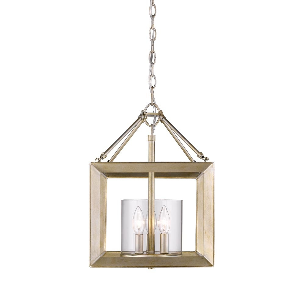 Bring artisanal elegance into your home with the Golden Lighting Smyth 3-light Semi-Flush Mount. Featuring a glass shade and a White Gold frame, it creates a warm and inviting atmosphere. The clear glass shade offers brilliant, unobstructed light, polished to a high-gloss shine for timeless appeal. This versatile glass shade complements a wide array of styles, making it an ideal choice for modern, traditional, and industrial decors alike. The White Gold finish blends warmth and coolness, providing a sophisticated glow with its rustic, brushed texture. This design is perfect for indoor spaces such as bedrooms and kitchens, ideally suited for locations not affected by moisture. The fixture's convertible design allows it to be installed as a semi-flush mount or pendant, with an adjustable height for sloped or flat ceilings. Overall dimensions of 11.75"W x 16.5"H x 11.75"D and requires 3 E12 Candelabra base bulbs (not included) with a maximum wattage of 60 per bulb. The Golden Lighting Smyth is an exquisite blend of form and function, bringing a touch of handcrafted glamour to your home decor.