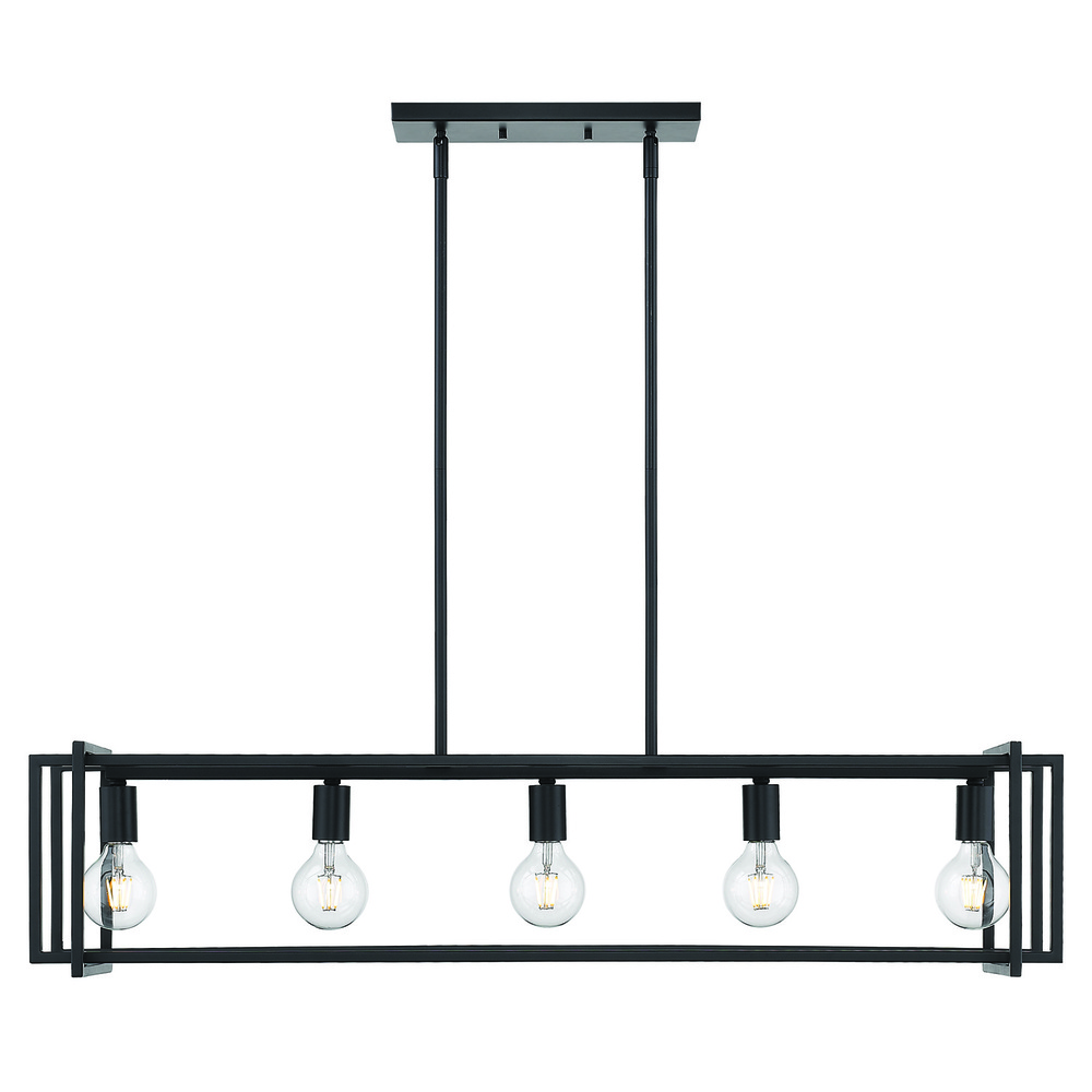 Bring modern elegance into your home with the Golden Lighting Tribeca 5-light Island Light in Matte Black. Designed to be effortlessly chic, this fixture enhances your space while providing ample illumination. This stylish light features no shade, allowing for open exposition of its clean geometric form. The matte black finish adds a soft yet sophisticated look, creating a striking contrast in contemporary and traditional settings. Perfectly tailored for kitchen islands, this fixture is dry location rated, ideal for indoor spaces away from moisture. The convertible design allows for installation as a semi-flush mount or pendant, with an adjustable height ranging from 11.375" to 51.375" for a customizable fit. Overall dimensions are 41"W x 9.25"H x 8.5"D, and it requires 5 E26 Medium base bulbs (not included), maximum 60 watts per bulb. The Tribeca island light is an exceptional addition to your home, marrying function with a modern aesthetic.