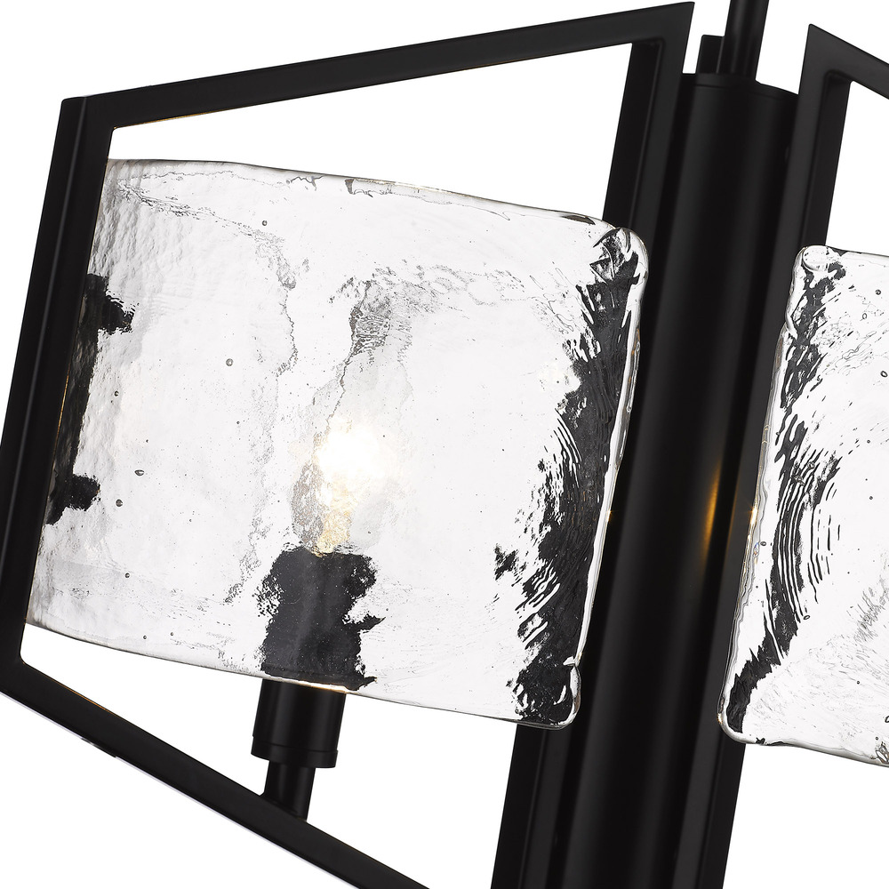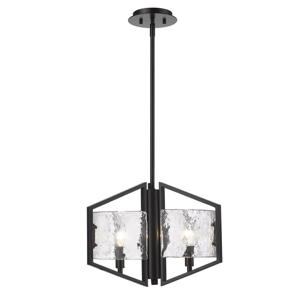 Bring industrial elegance into your home with the Golden Lighting Varsha 3-light Pendant. Featuring a glass shade and a matte black frame, it creates a welcoming atmosphere. The glass shade showcases a hammered water glass design, characterized by an irregular texture that beautifully refracts light, emitting a complex glow that adds drama and artistry to your space. The matte black finish is timeless and versatile, providing an understated elegance that complements numerous decor styles from minimalist to bold contemporary. Perfect for kitchens, dining rooms, and bathrooms, the pendant is damp location rated, making it suitable for covered and semi-enclosed spaces. Installation is a breeze on sloped ceilings with adjustable height options from 19.25" to 55.25". Overall Dimensions: 16.75"W x 11.75"H x 16.75"D. Requires 3 E12 candelabra base bulbs (not included), with a maximum wattage of 60 per bulb. Perfect for those seeking stylish yet functional lighting, the Varsha Pendant will be a beautiful addition to your home.