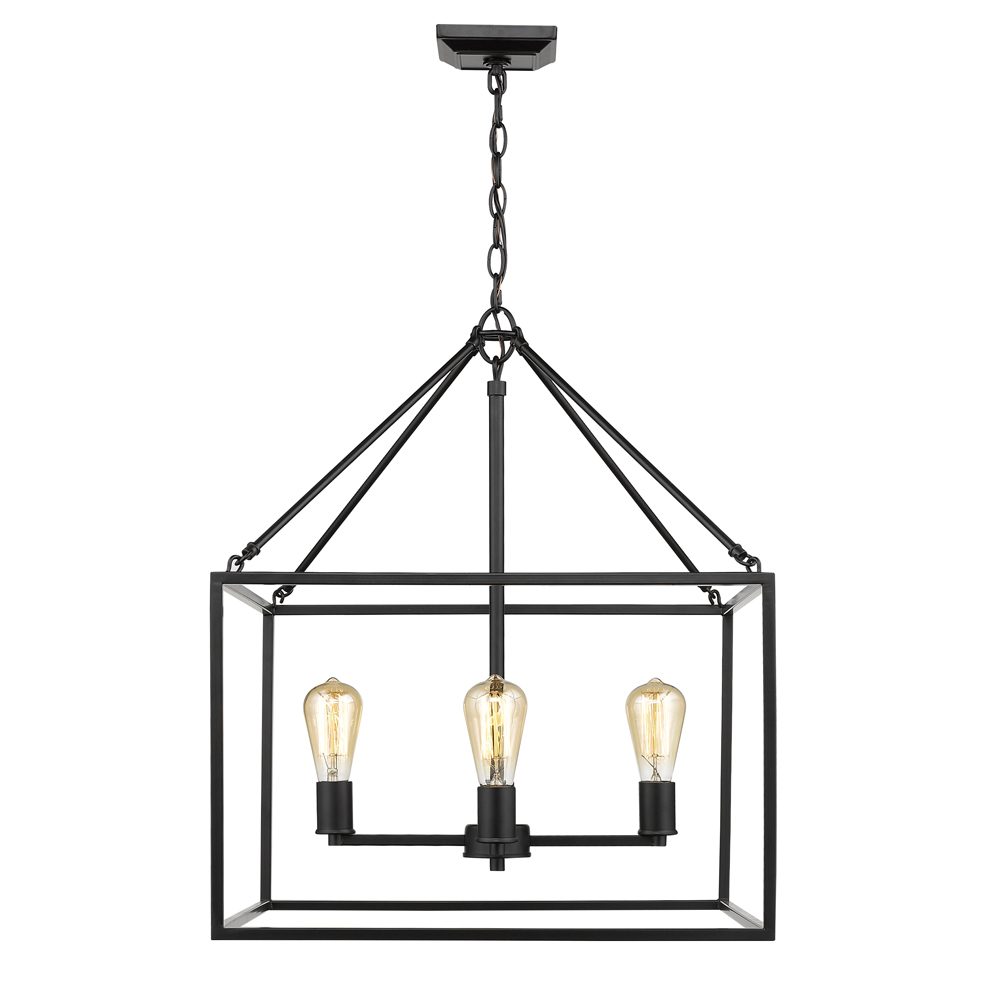 Introduce modern sophistication into your space with the Golden Lighting Wesson 4-light Chandelier. This fixture boasts a bold design and a classic Matte Black finish, perfect for making a statement in any room. With no shade present, the chandelier highlights its robust raw metal frame and the exposed bulbs, embodying a utilitarian aesthetic that reflects the charm of industrial design. The Matte Black finish offers timeless versatility, absorbing light to create a soft visual appeal that complements various decor styles. This chandelier suits dining rooms, foyers, or living spaces, and is dry location rated for areas away from moisture. It is compatible with sloped ceilings and features adjustable height, providing customizable options for your lighting needs. Overall Dimensions: 21"W x 26"H x 21"D. Requires 4 E26 Medium base bulbs (not included), max 60 wattage per bulb. Elevate your home with this stunning fixture — a blend of functionality and aesthetics that stands out.
