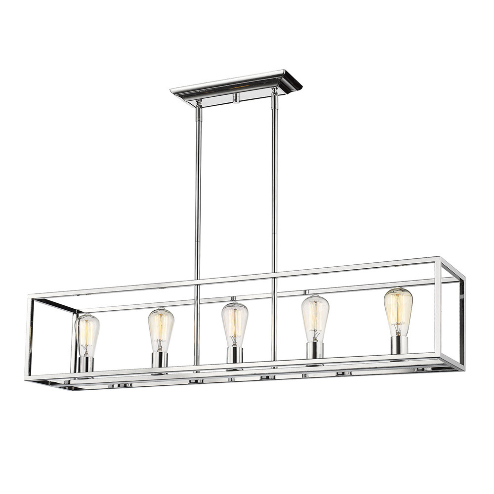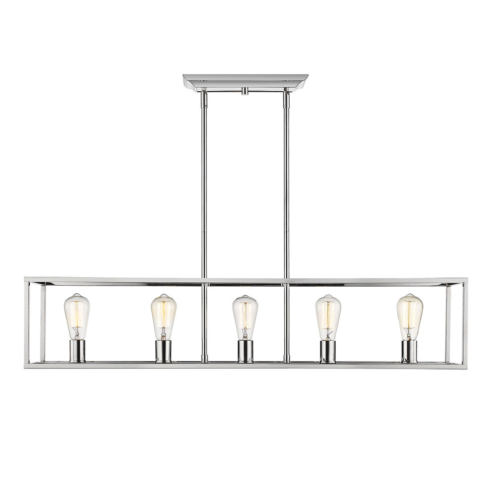 Bring modern elegance into your home with the Golden Lighting Wesson 5-light Island Light. With a brilliant Chrome finish, it creates a welcoming atmosphere. Its cage-like design features a robust metal frame and exposed bulbs, celebrating the beauty of function and unfinished materials. The highly reflective surface integrates seamlessly into any decor style, from ultra-modern to classic traditional. Tailored for kitchen islands, this fixture is Dry Location Rated, suitable for indoor spaces not subject to moisture. Easily install on sloped ceilings, with adjustable height from 16.25" to 36.25". Overall dimensions are 41"W x 8.75"H x 8"D, requiring 5 E26 Medium base bulbs (not included) at a max wattage of 60 per bulb. Illuminate your space with this beautiful and durable fixture.