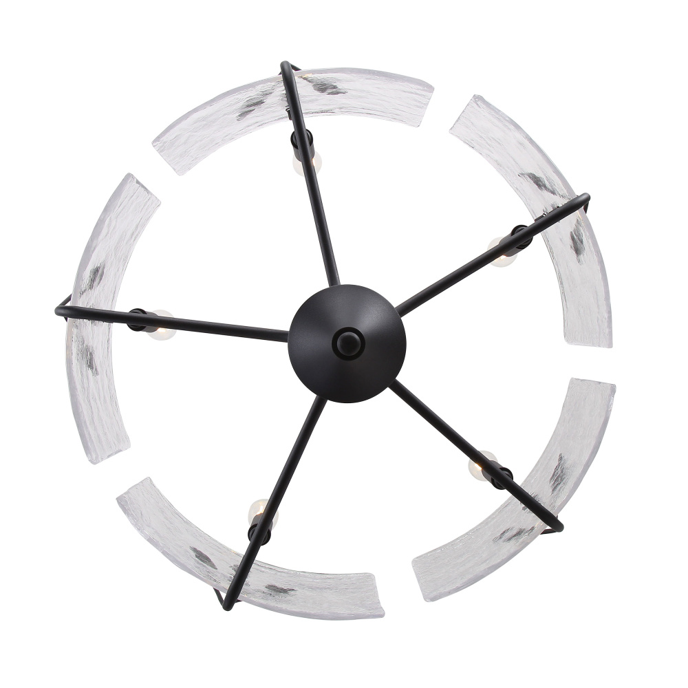 Bring nature-inspired elegance into your home with the Wry Lighting Bloem 5-light Pendant in Natural Black. Featuring a glass shade and a natural black frame, it creates a welcoming atmosphere. This glass shade showcases a hammered water design, featuring an organic texture that distorts and refracts light beautifully. The natural black finish offers a softer, more organic take on classic black, resembling a dark charcoal with a matte surface, perfect for a range of styles. Ideal for indoor spaces not subject to moisture, such as bedrooms or hallways, this pendant is sloped-ceiling compatible and its adjustable height ranges from 25.5" to 99". Overall dimensions are 24"W x 22"H x 24"D, and it requires 5 E12 candelabra base bulbs (not included) with a maximum of 60 watts per bulb. Add a stylish statement to your home with this handcrafted fixture, celebrating quality and artistry.