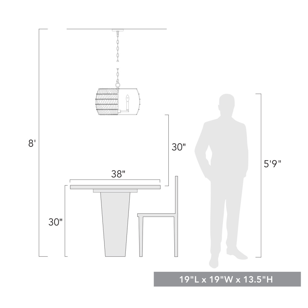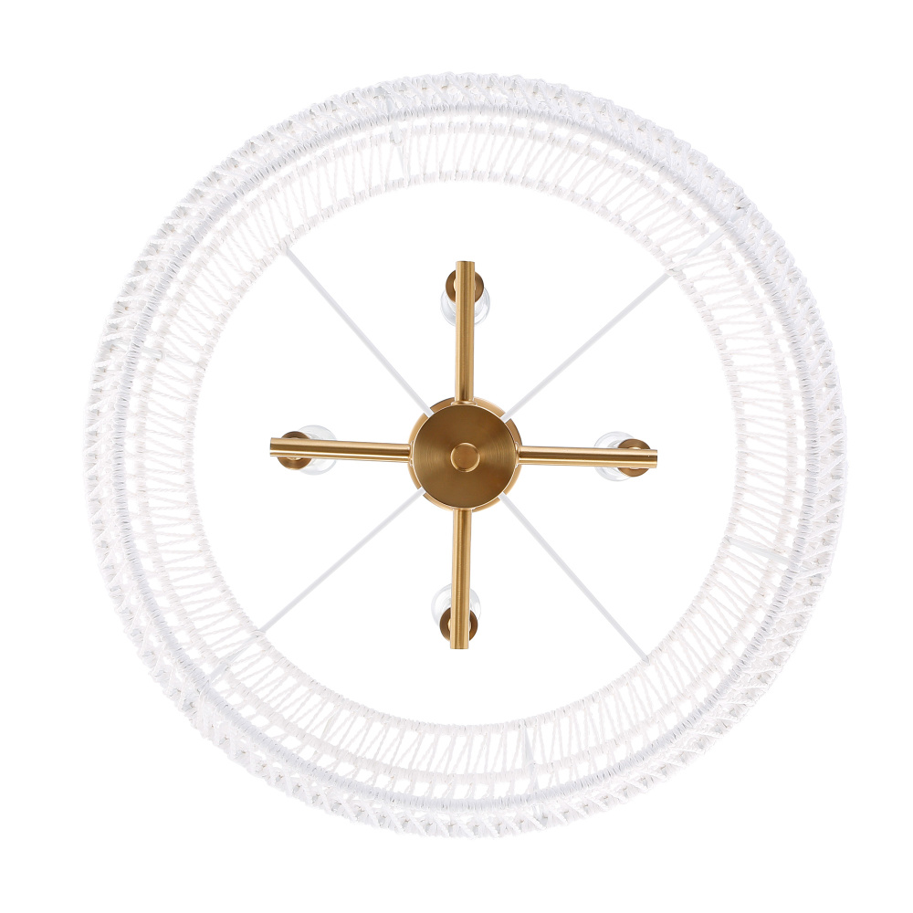 Bring coastal elegance into your home with the Wry Lighting Ellie 4-light Chandelier. Featuring a rope shade and a modern brushed gold frame, it creates a welcoming atmosphere. The bleached white raphia rope shade offers a clean, bright, and textural look, reminiscent of sun-bleached rope found on a tropical beach. This artisanal material enhances the chandelier's relaxed coastal feel while beautifully diffusing light. Our modern brushed gold finish radiates warmth and has a luxe appeal, treated with a fine brushing that creates a sophisticated surface. Make a grand impression in dining rooms and foyers or elevate bedrooms and living spaces with a touch of classic elegance. This fixture is damp location rated, suitable for covered areas with occasional moisture. The convertible design allows for adjustable height installation on sloped or flat ceilings, ensuring a perfect fit in any space. Overall Dimensions: 19"W x 13.5"H x 19"D, Requires 4 E12 Candelabra base bulbs (not included), max 60 watts per bulb. With its timeless design and quality craftsmanship, this chandelier is perfect for those seeking to add a chic yet relaxed vibe to their home.