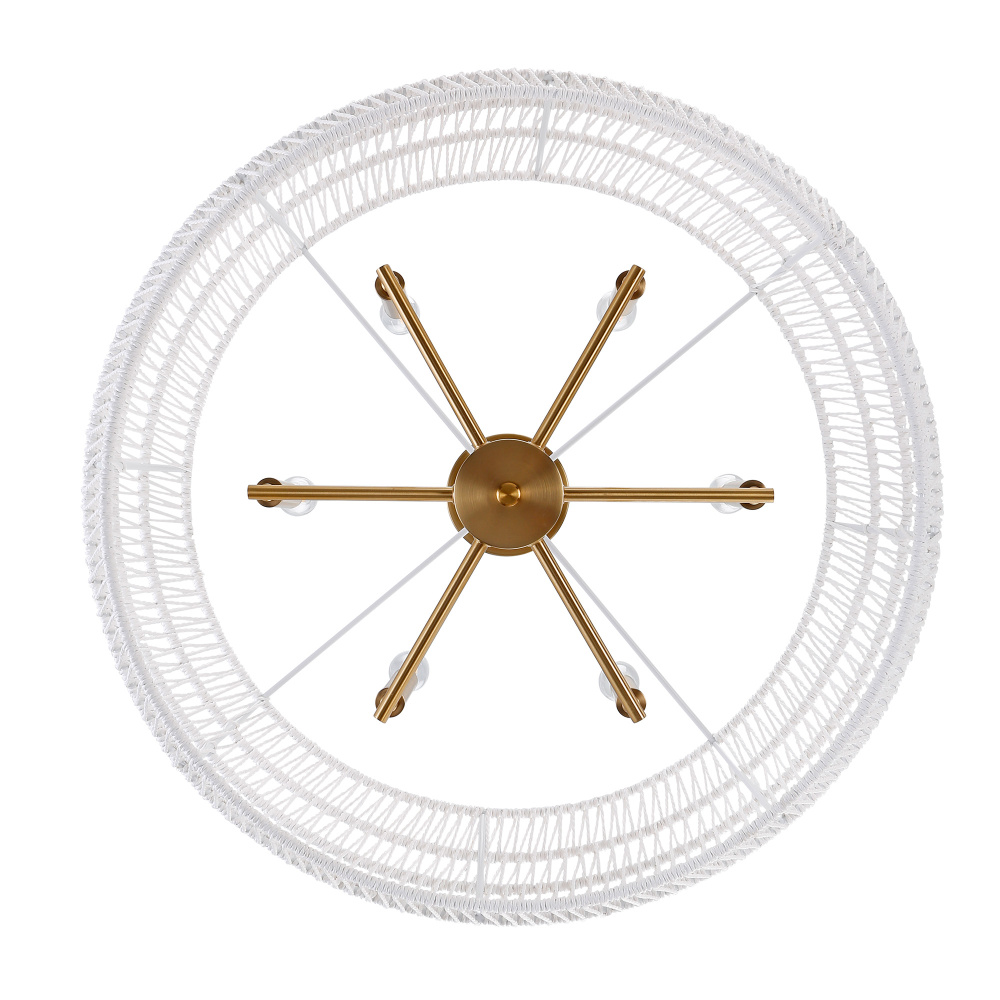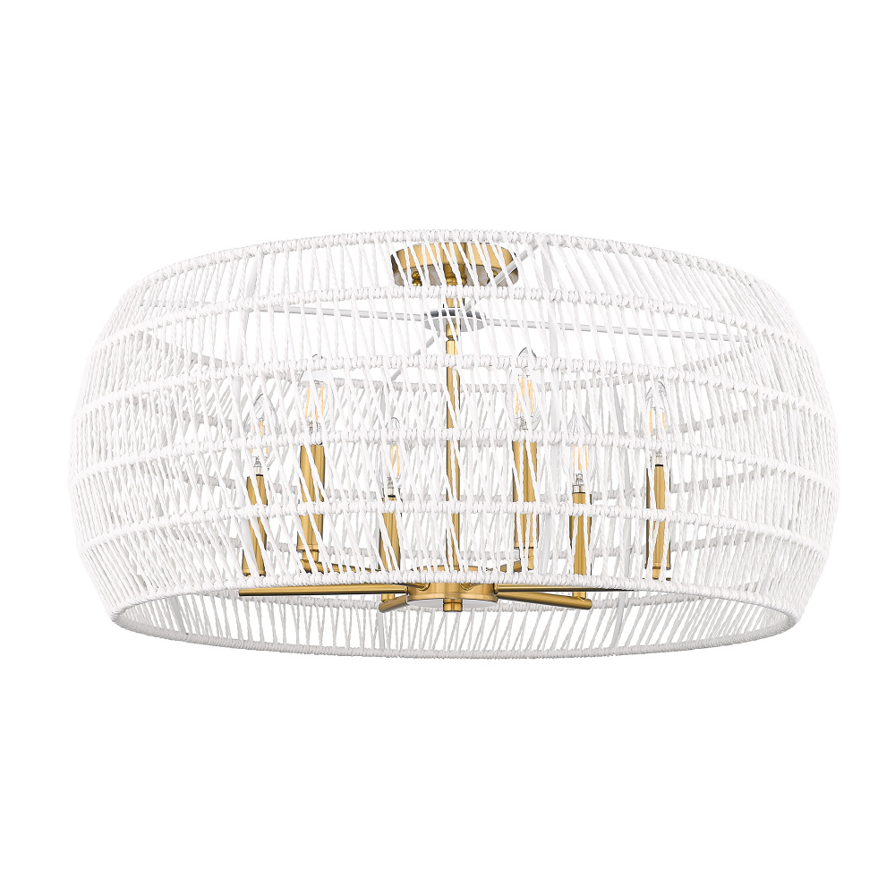 Bring coastal elegance into your home with the Wry Lighting Ellie 6-light Semi-Flush Mount. Featuring a rope shade and a modern brushed gold frame, it creates a welcoming atmosphere. The bleached white raphia rope shade offers a breezy, coastal vibe, enhancing the intricate texture and organic appearance that draws attention and admiration. Our modern brushed gold finish exudes a radiant warmth, enhanced by a satin sheen that beautifully diffuses light, creating an inviting glow throughout your space. This versatile light fixture is suitable for entryways, bedrooms, kitchens, and living areas with mid-height ceilings. Damp-location rated, it’s perfect for covered and semi-enclosed spaces, such as bathrooms and laundry rooms. Convertible with an adjustable height design, you can install it as either a semi-flush mount or a pendant to fit your space perfectly. Overall dimensions are 27.13"W x 13.25"H x 27.13"D, requiring 6 E12 candelabra base bulbs (not included) with a maximum wattage of 60 per bulb. Elevate your home decor with this stunning and practical lighting fixture.
