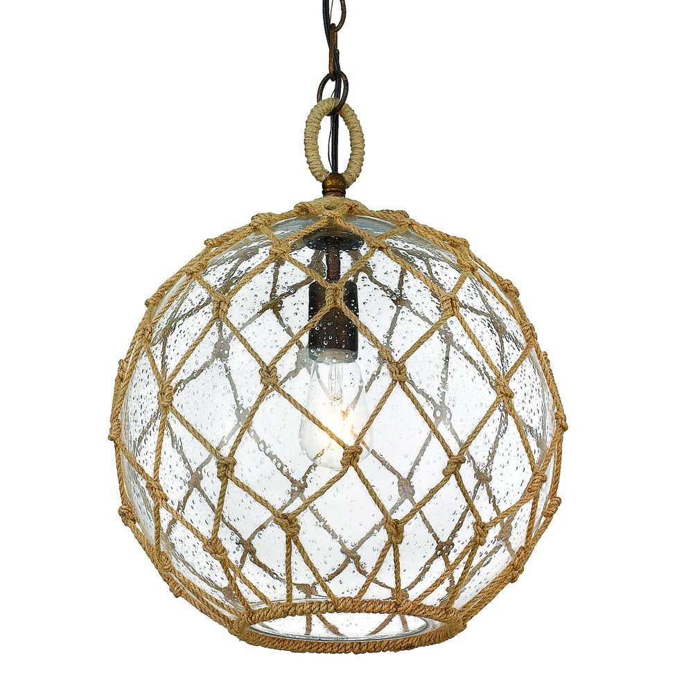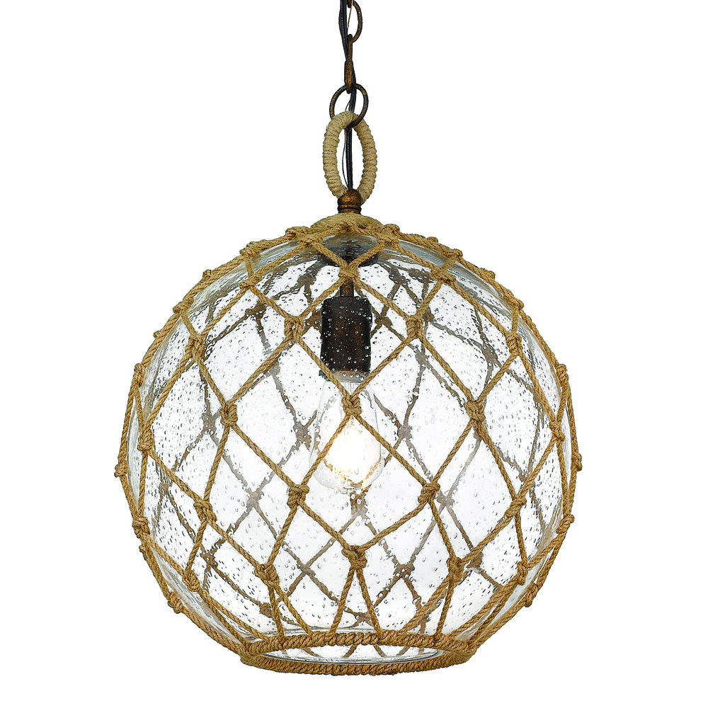 Embrace the charm of coastal elegance with the Wry Lighting Haddoc 1-light Pendant. Featuring a glass shade and a burnished chestnut frame, it creates an inviting atmosphere. The seeded glass shade adds distinctive antique-inspired texture, illuminated by the warm glow of the bulb. The burnished chestnut finish, with its rich tones and antique gold highlights, creates a welcoming glow and timeless feel. Damp location rated, this pendant is well-suited for covered areas, making it ideal for dining rooms, entryways, and kitchens. Sloped ceiling compatible and adjustable in height (22" to 94"), this fixture offers versatility for any space. Dimensions are 13.75"W x 18.5"H x 13.75"D, requiring 1 E26 medium base bulb (not included) with a maximum wattage of 100. Enhance your coastal decor with this quality piece, appreciated by customers for its rustic elegance and craftsmanship.