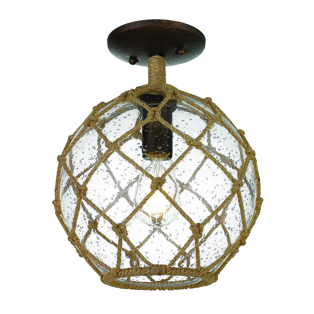 Bring Coastal elegance into your home with the Wry Lighting Haddoc 1-light Semi-Flush Mount in Burnished Chestnut. Featuring a glass shade and a Burnished Chestnut frame, it creates a welcoming atmosphere. The seeded glass shade adds a vintage character, with small air bubbles that catch the light, gently diffusing it for a warm and inviting glow. Rich and earthy, the Burnished Chestnut finish has the warm, substantial feel of a cherished heirloom, enhanced by a hand-rubbed effect that reveals luminous antique gold highlights. This classic finish brings warmth and timeless tradition to any space. This versatile fixture is damp location rated, making it suitable for covered and semi-enclosed areas like bathrooms and covered porches. Ideal for mid-height ceilings, it beautifully complements entryways, bedrooms, kitchens, and living areas. Requires 1 E26 medium base bulb (not included) with a maximum wattage of 60. Overall dimensions are 9.88"W x 12.75"H x 9.88"D. Elevate your decor style with this stunning light fixture that offers a blend of natural charm and artisanal appeal, perfect for your coastal-inspired space.