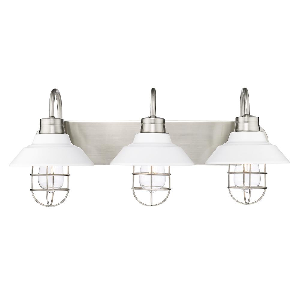 Illuminate your bathroom with the stylish and functional Wry Lighting Lana 3-light Vanity. Featuring a metal shade and a Pewter finish, it offers a bright, contemporary light that enhances your grooming routine. The matte white shades provide a clean and non-reflective surface, allowing for clear, flattering illumination. The Pewter finish, with its sophisticated satin lustre, diffuses light gracefully, contributing to an elegant atmosphere in your bathroom. Perfect for a variety of spaces, this fixture is Damp Location Rated and ideal for areas with occasional moisture. The dimensions of 26"W x 11"H x 10.5"D accommodate any bathroom space fitting seamlessly into your décor. It requires 3 E26 Medium base bulbs (not included), with a max wattage of 100. Elevate your bathroom aesthetics with this well-crafted fixture that brings practical elegance to everyday routines.
