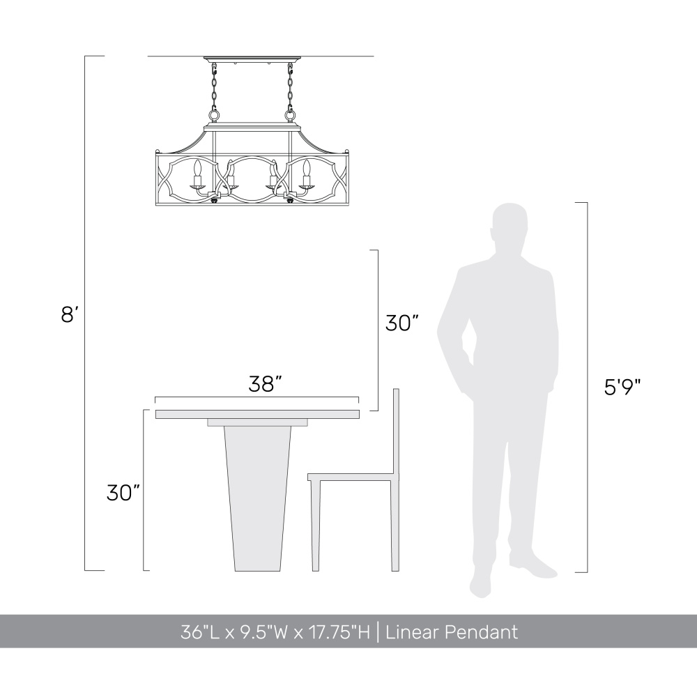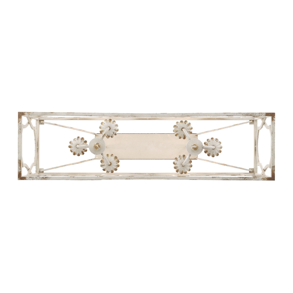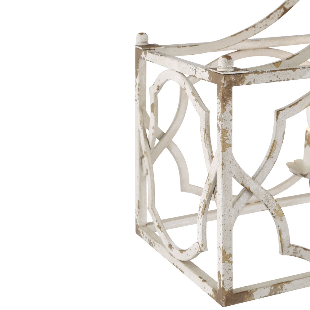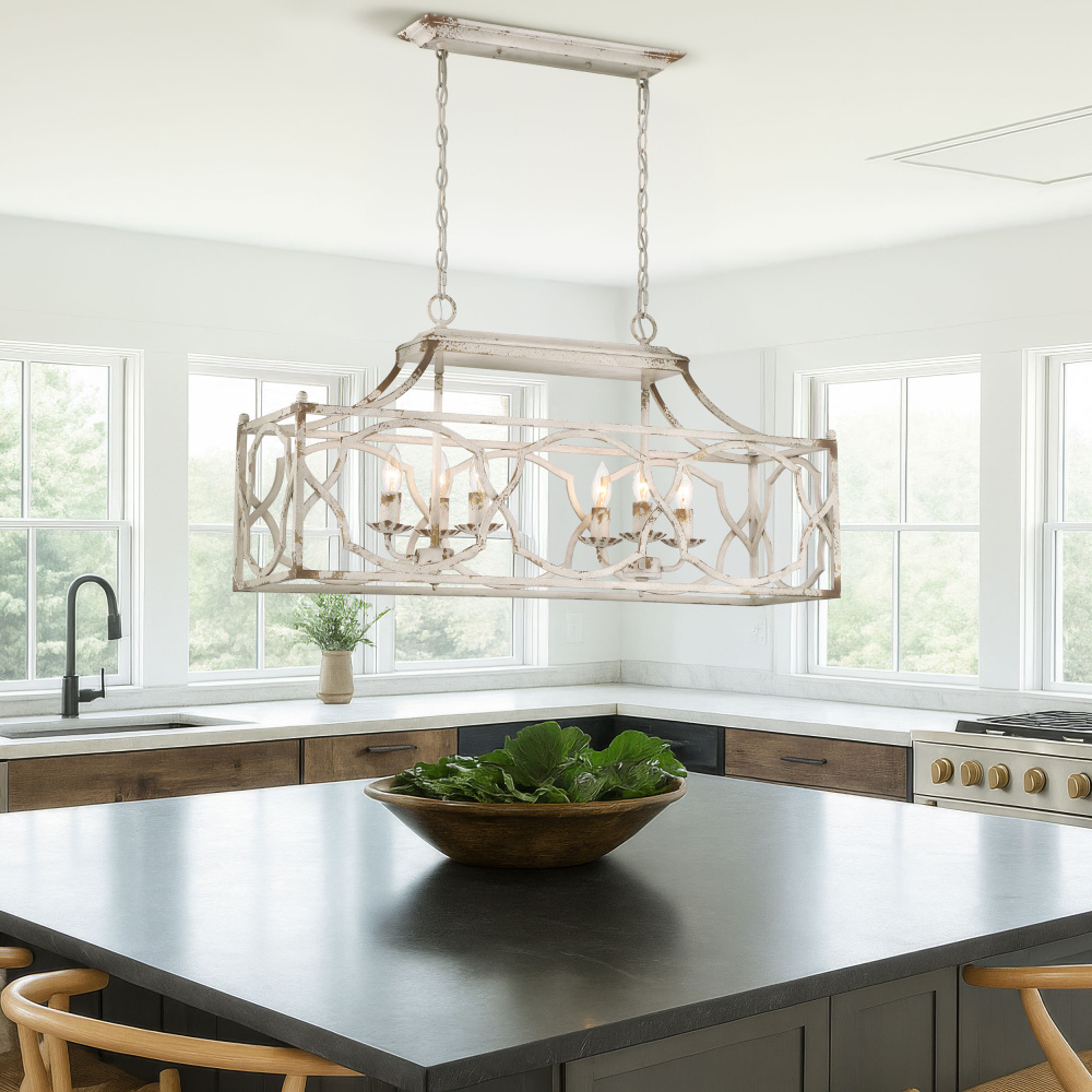 Bring farmhouse elegance into your home with the Wry Lighting Laurent 6-light Island Light in Antique Ivory. It creates a welcoming atmosphere with its beautiful open-frame lantern design. This fixture’s structure exhibits a unique hand-painted surface that emphasizes character without a traditional shade. It features a charming Antique Ivory finish, evoking the warmth and romance of a treasured European heirloom, characterized by its creamy ivory base artfully aged with delicate craquelure texture and dark patina, highlighting every detail. Designed for kitchen islands, this fixture is ideal for dry locations such as bedrooms, living rooms, and hallways. It offers adjustable height capabilities to perfectly fit your space while being sloped-ceiling compatible. Dimensions are 36"W x 17.75"H x 9.5"D and it requires six E12 candelabra base bulbs (not included) with a maximum wattage of 60 per bulb. This artisanal piece not only illuminates your space but also serves as a stunning style focal point.