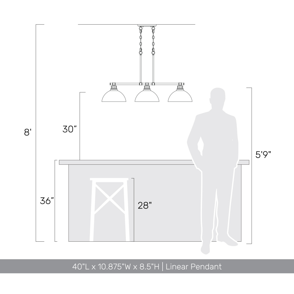 Bring traditional elegance into your home with the Yep by Golden Lighting Duncan 3-light Island Light. Featuring a black shade and a Chrome frame, it creates a welcoming atmosphere. The black shade is crafted with a high-gloss finish that produces a luxurious, reflective surface, adding a touch of modern glamour. This dramatic shade contrasts beautifully with the sleek and bright Chrome gloss, creating a durable and sophisticated style statement. Ideal for dry locations, this fixture is tailored for kitchen islands, providing both utility and modern flair. It features a convertible design with adjustable height installation, suited for either sloped or flat ceilings. Dimensions: 40"W x 8.5"H x 10.88"D. Requires 3 E26 Medium base bulbs (not included), with a maximum wattage of 100 per bulb. Transform your space with this timeless piece that merges style and functionality.