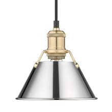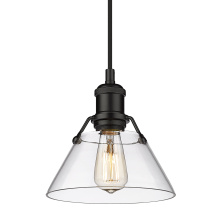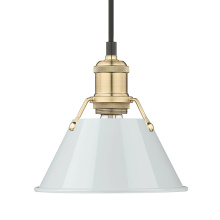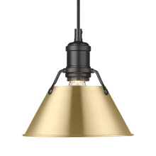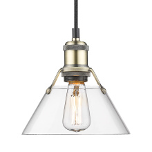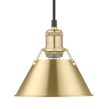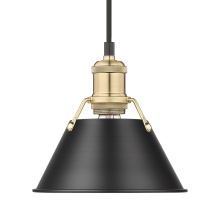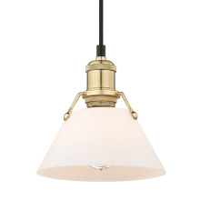 Bring industrial elegance into your home with the Yep by Golden Lighting Orwell 1-light 8in Pendant. Featuring a metal shade and an aged brass frame, it creates a welcoming atmosphere. The metal shade showcases a classic Matte Black finish, delivering a deep and uniform black color with a smooth, non-reflective matte surface for a sophisticated look. Embrace timeless elegance with our Aged Brass finish, offering a warm, inviting glow reminiscent of vintage heirlooms. Add a stylish statement to kitchens, dining rooms, or bedrooms—perfect for focused yet decorative illumination in entryways and bathrooms. Damp Location Rated: Suitable for covered and semi-enclosed spaces. Easily install on sloped ceilings and customize the hanging length to suit your space, with an adjustable height between 15" and 129". Overall Dimensions: 7.5"W x 7.5"H x 7.5"D. Requires 1 E26 medium base bulb (not included), max 100 watts. Illuminate your home with this quality fixture from Yep by Golden Lighting, adding a touch of understated luxury and character wherever you need it.