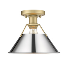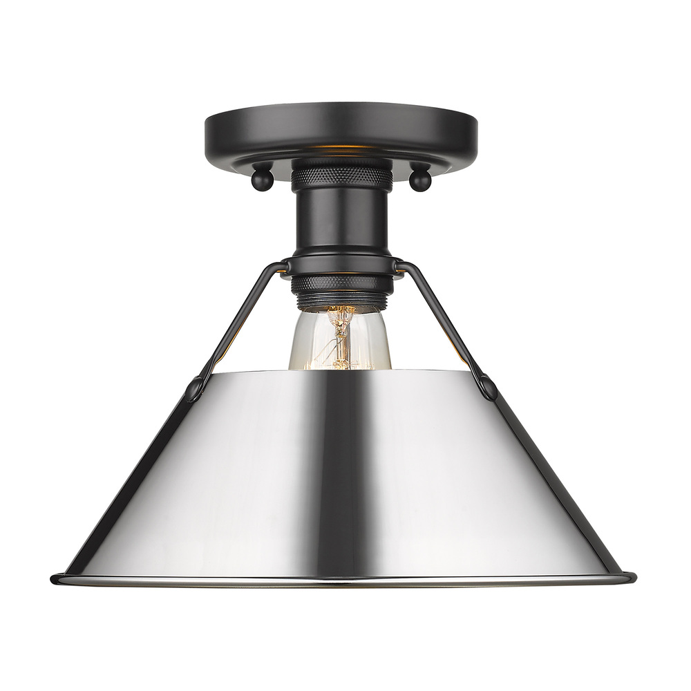 Bring industrial elegance into your home with the Yep by Golden Lighting Orwell 1-light Flush Mount. Featuring a metal shade and a Matte Black frame, it creates a welcoming atmosphere. The metal shade shines in a Polished Chrome finish, which reflects light beautifully, adding a bright and contemporary touch. Known for its high-shine gleam, this shade heightens the fixture's visual interest and encourages ambient lighting. The Matte Black finish is timeless and versatile, offering a cozy ambiance for rooms ranging from bathrooms to hallways. Damp location rated, this fixture works well in semi-enclosed spaces with occasional moisture. Overall Dimensions: 10"W x 8"H x 10"D. Requires 1 E26 Medium base bulb (not included), max 100 watts. Transform your space with this stylish flush mount light that blends modern design with utility, perfect for various settings.