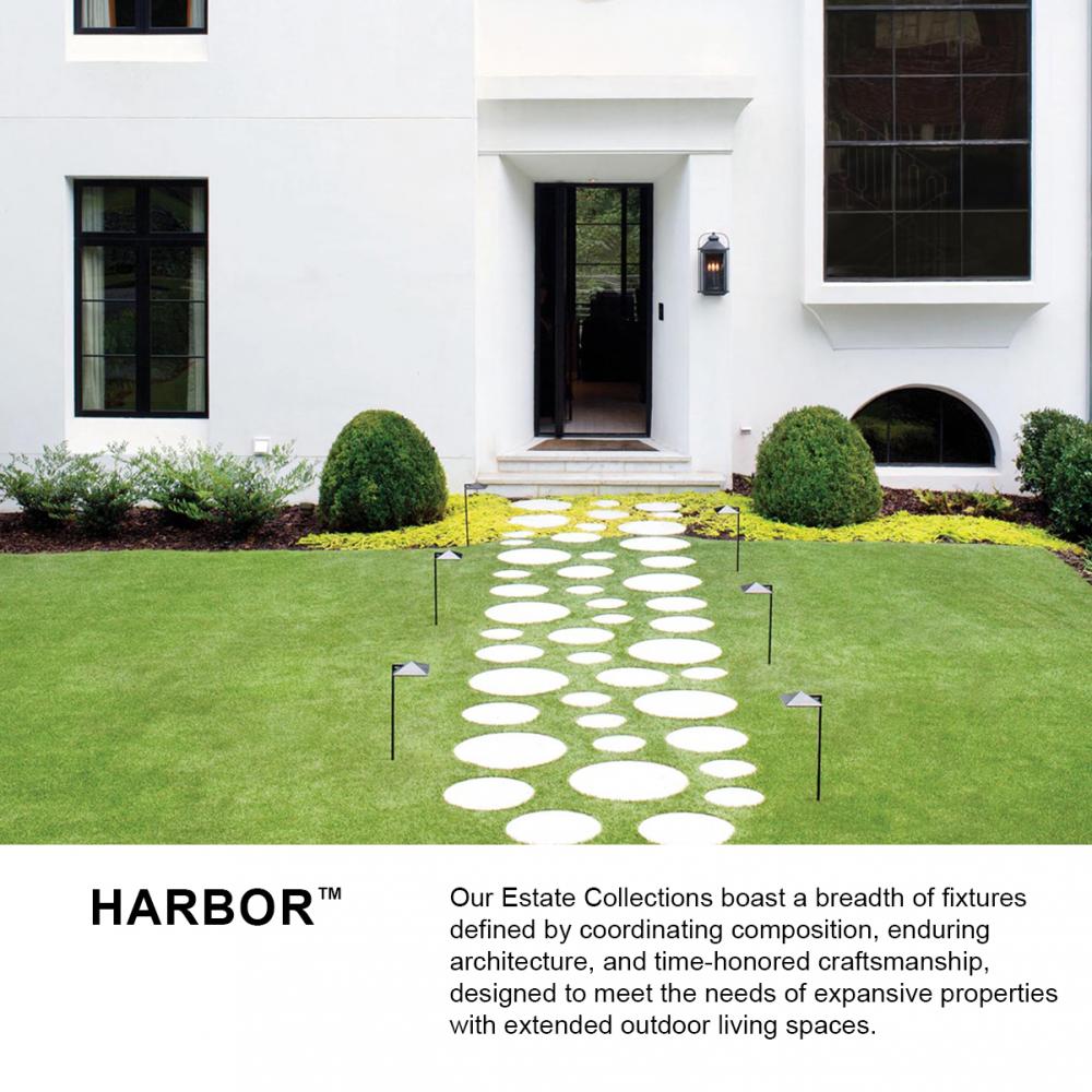 Harbor has an updated nautical feel, with a style inspired by the clean, strong lines of a welcoming lighthouse. The cast aluminum and brass construction is accented by bold stripes against the warm etched amber seedy bound glass.