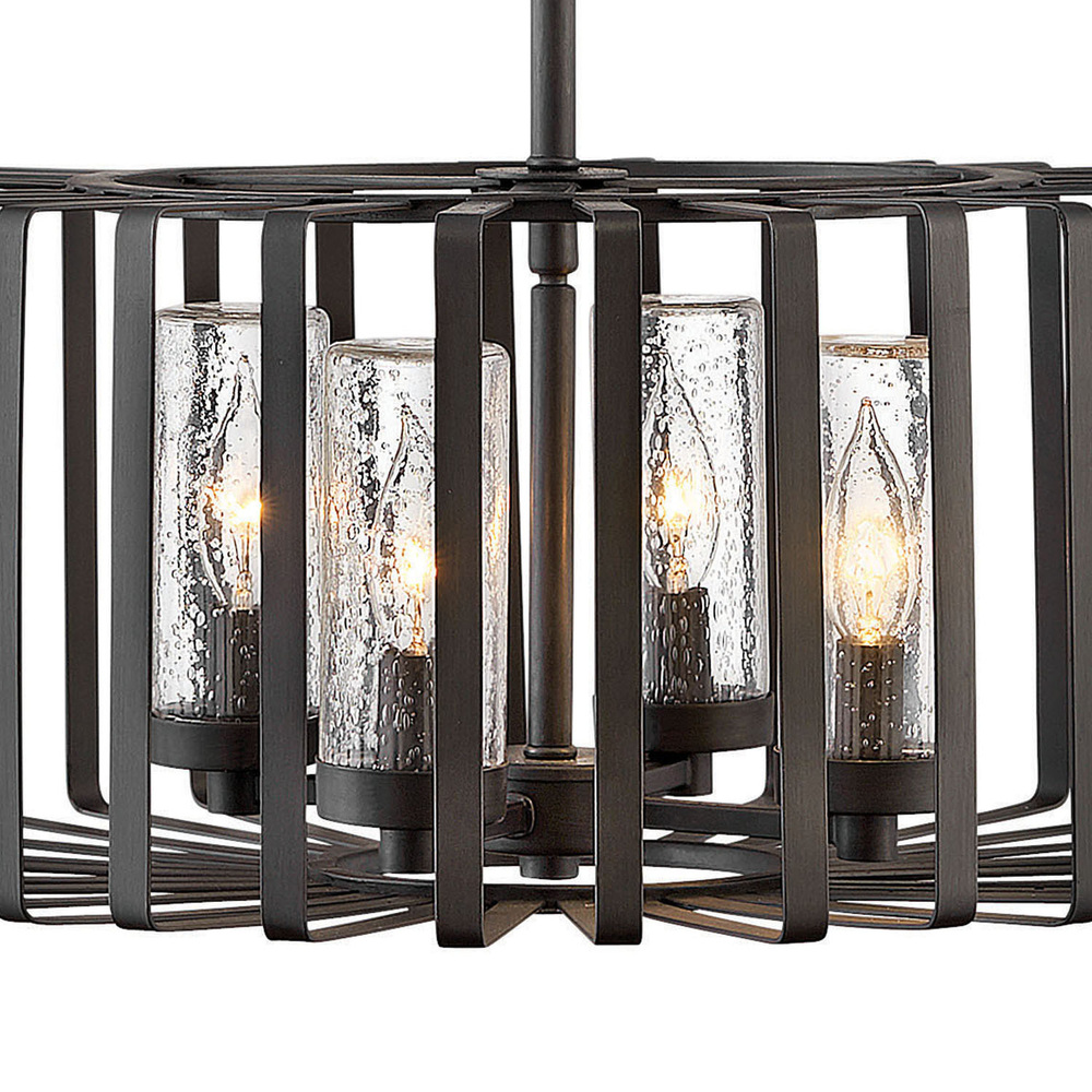 Reid uses an iconic profile featuring an airy, open cage to capture the center of attention. A candelabra with clear seedy glass columns highlights the transitional style, making it a modern mix of classic and contemporary. Weather-resistant metal with a Brushed Graphite finish complements any space, inside or out.