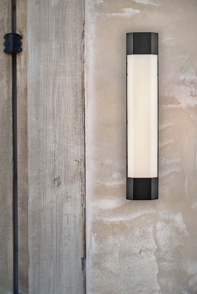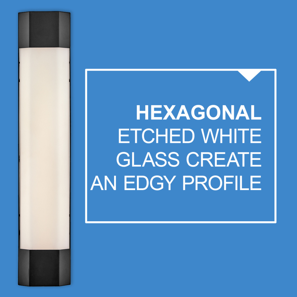 View the many sides of Facet. Interesting angles combine with bold metal features to create an edgy and contemporary profile that is unpretentious yet unforgettable. Hexagonal etched white glass is showcased by a bold Black finish.