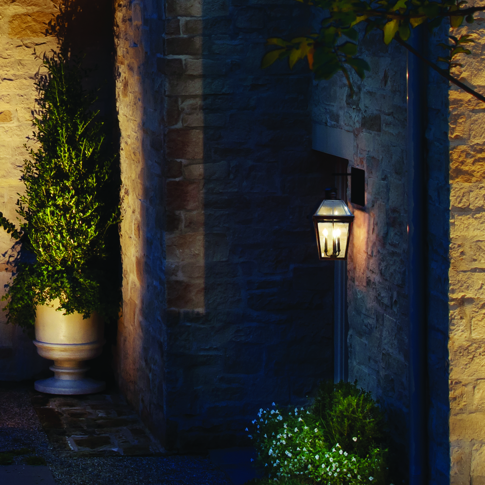 Handcrafted of solid brass, Nouvelle's construction evokes timeless vigor enhancing the appearance of a range of façades, from French Traditional to Modern. Nouvelle’s Blackened Brass cage stands out among its slightly tapered, four-sided glass panels to reinforce its simple charm.