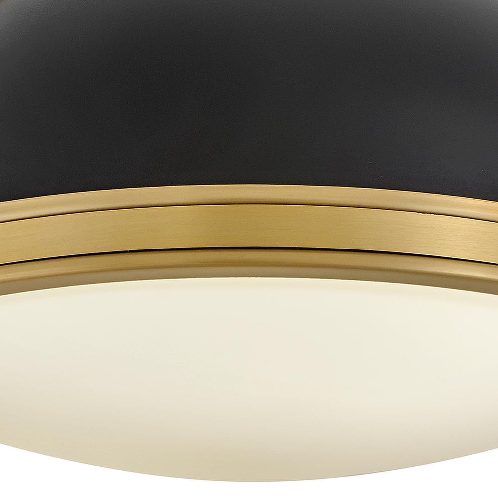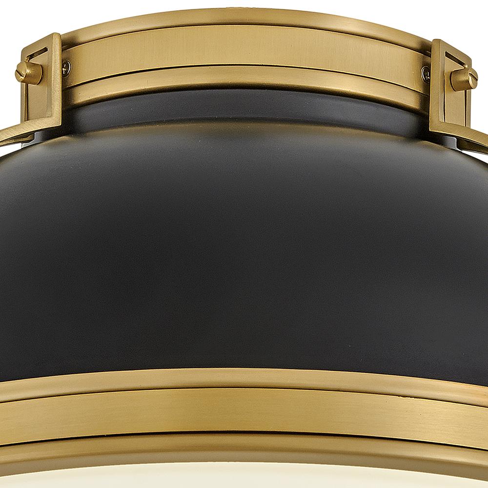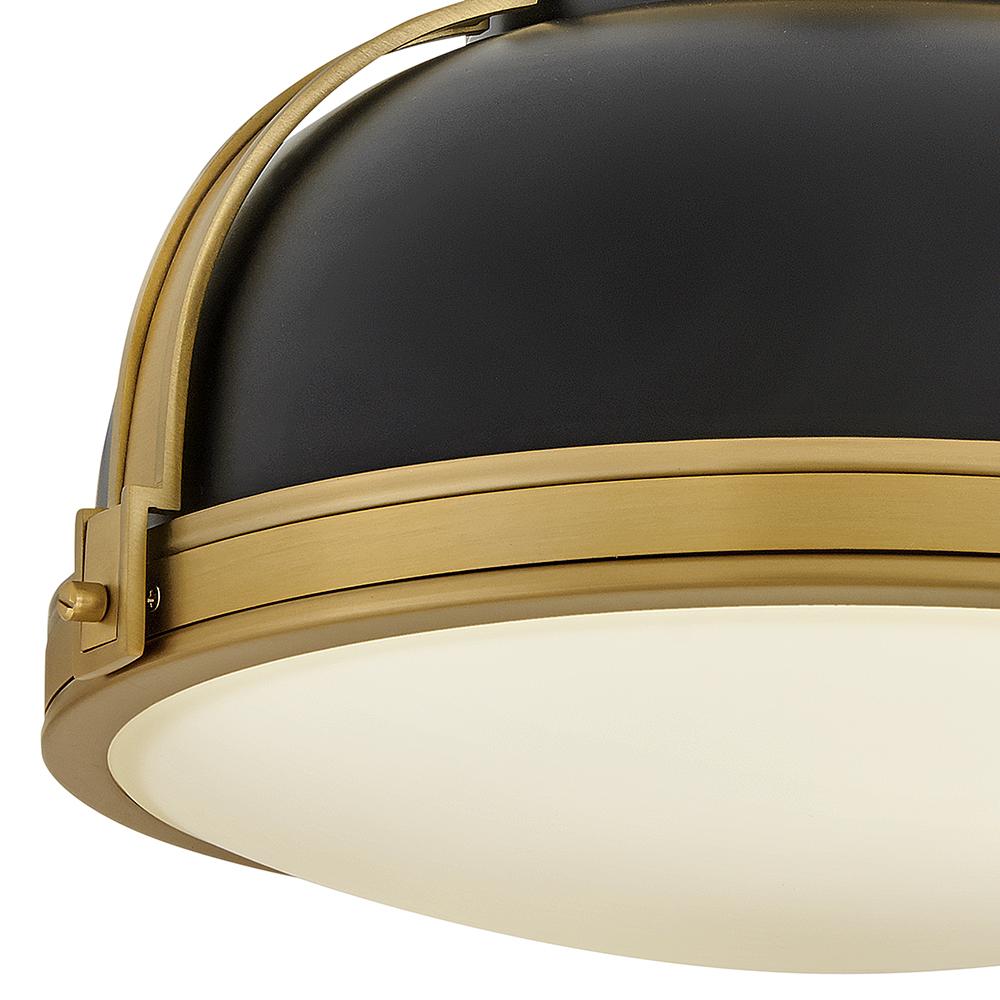 Timeless with a classic equestrian aesthetic, Barton’s metal dome shade with double-strap design is available in Matte Black, Matte White, or Gloss White with Navy finishes complemented by Lacquered Brass and an etched opal glass diffuser.