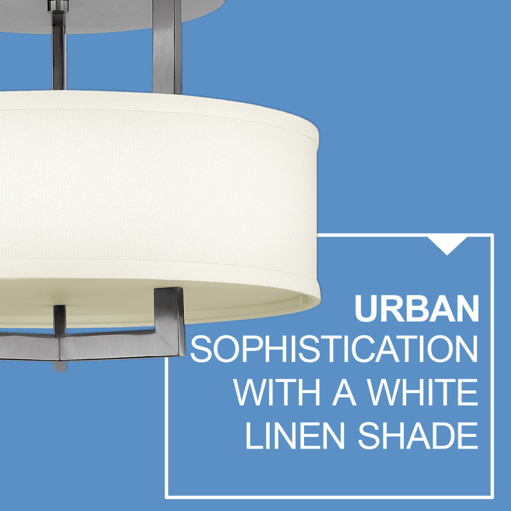 Hampton is a modern transitional design, offering the ultimate in urban sophistication. The minimal, rectangular frame is softened by a contemporary off-white linen drum shade.