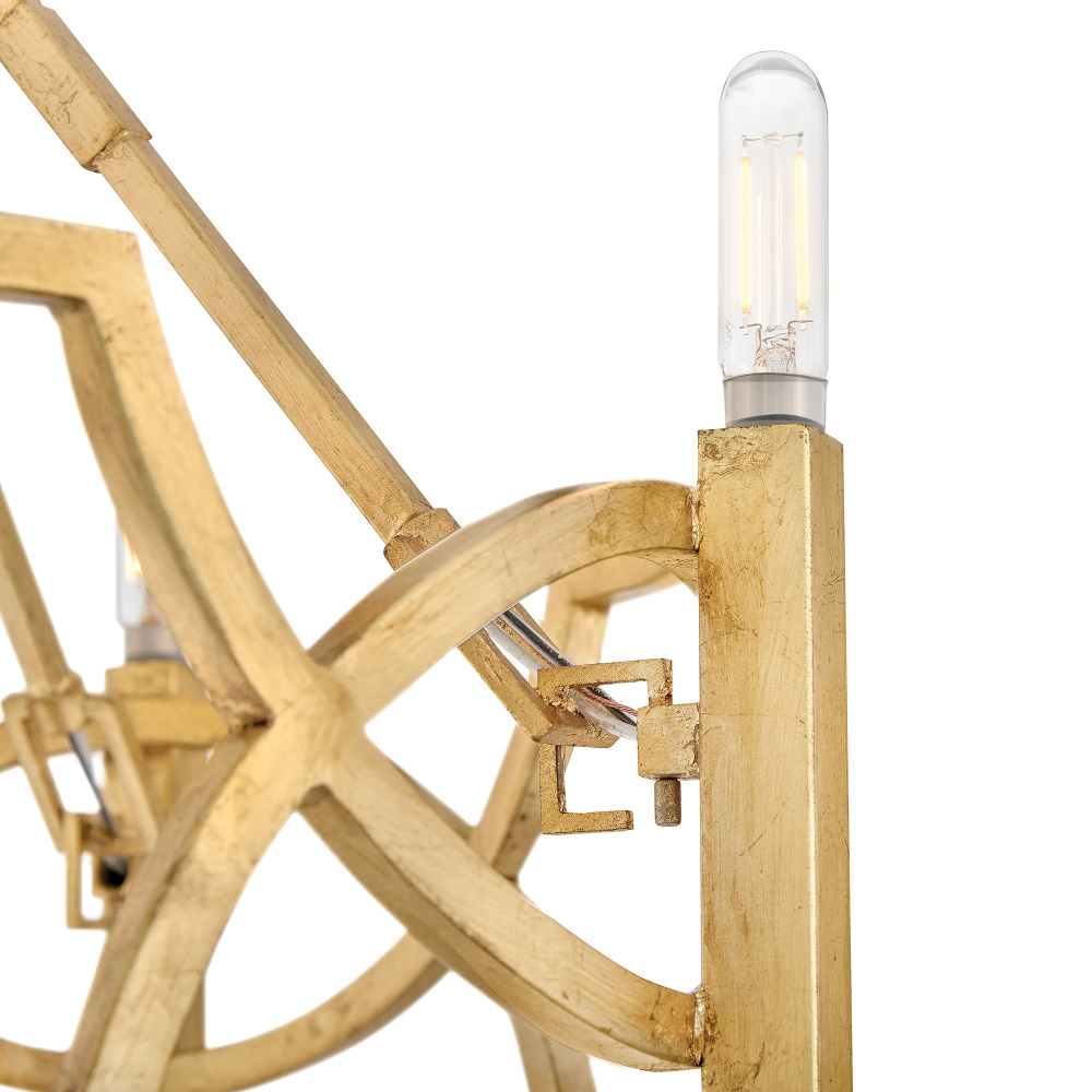 Leona’s decorative scrollwork is crafted from a gently curved, smoothly welded frame finished in hand-leafed Distressed Brass. Clean shapes complemented by exposed candelabra lamps create a family of formal fixtures with undeniable charm.