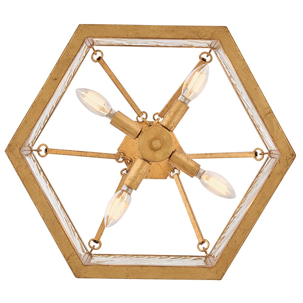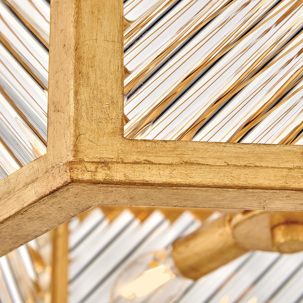 A reimagining of vintage designs from the 40s and 50s, Sura’s transitional, hexagonal Distressed Brass frame creates a glamorous yet understated and tailored appeal. Cylindrical glass rods set at alternating angles echo a soft herringbone pattern, juxtaposing geometry within geometry. Layered details create a reeded effect that is reflective and alluring.