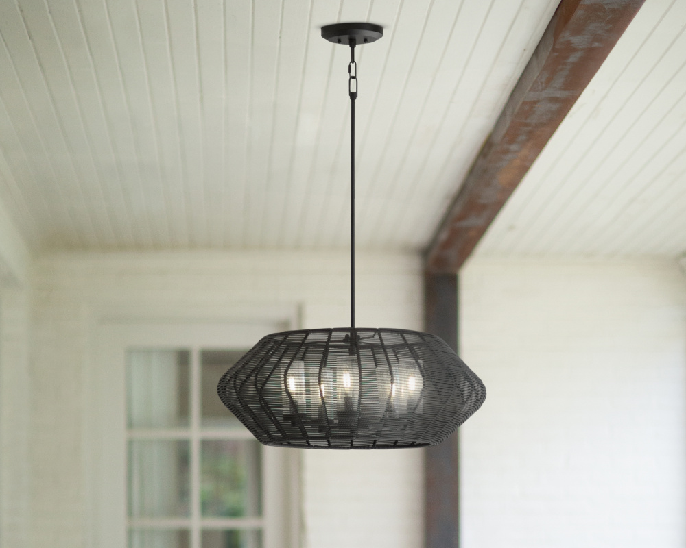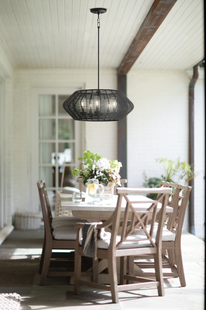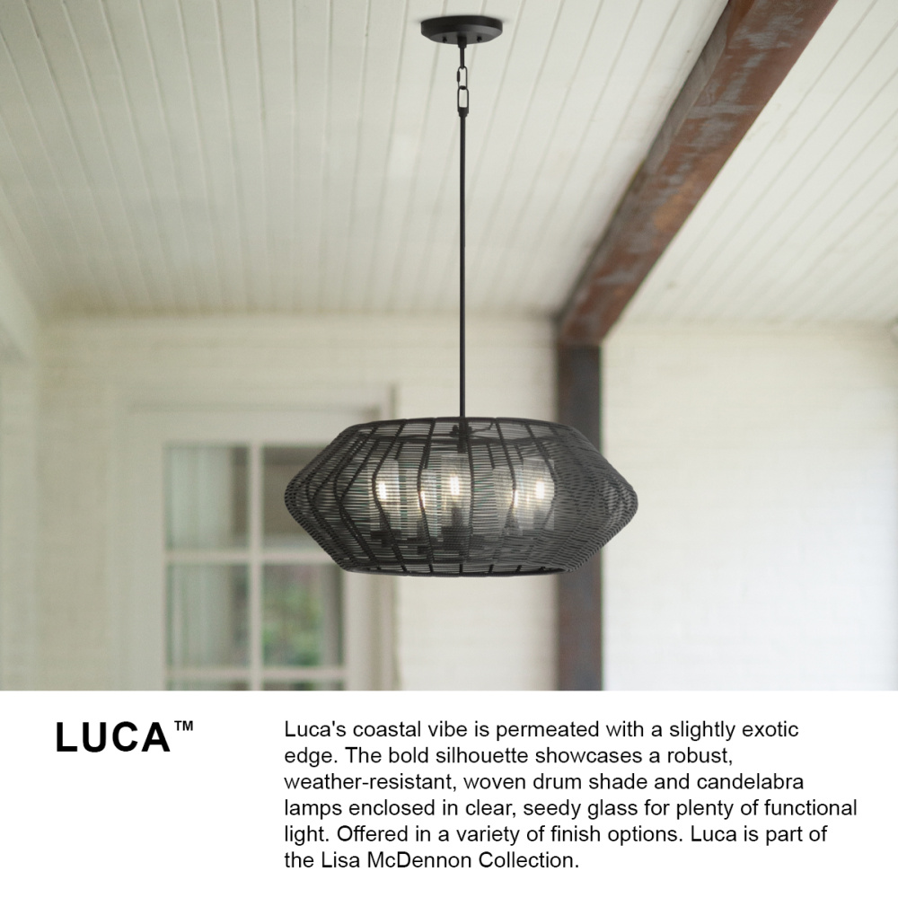 Luca's coastal vibe is permeated with a slightly exotic edge. The bold silhouette showcases a robust, weather-resistant, woven drum shade and candelabra lamps enclosed in clear, seedy glass for plenty of functional light. Offered in a variety of finish options. Luca is part of the Lisa McDennon Collection.