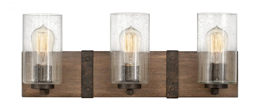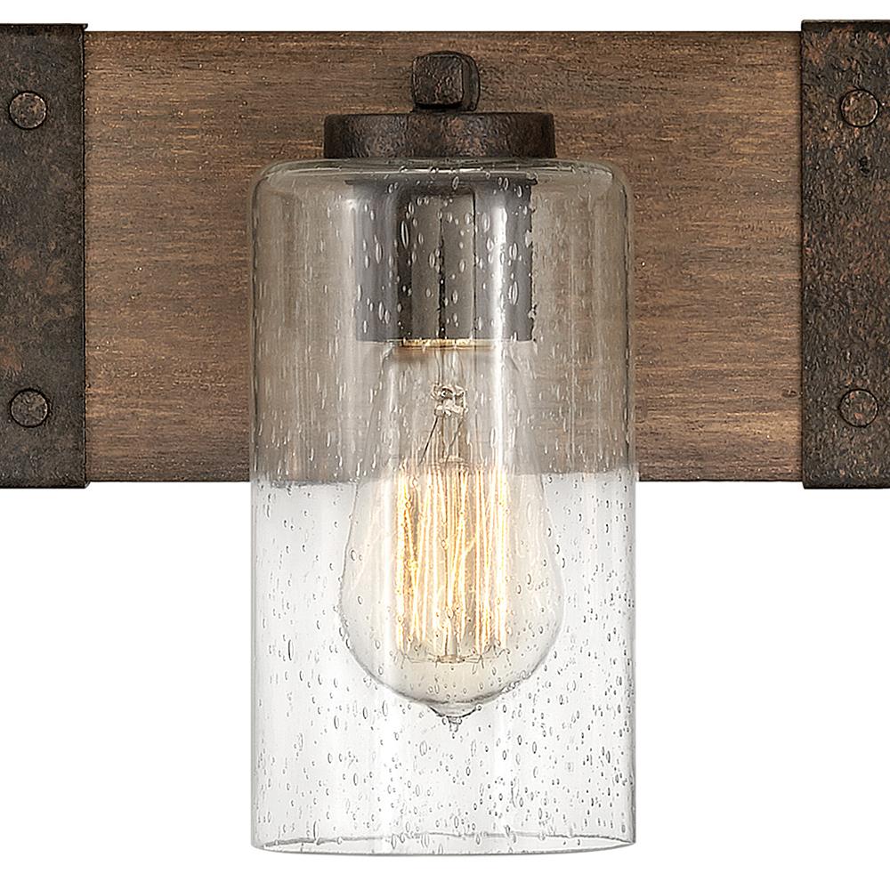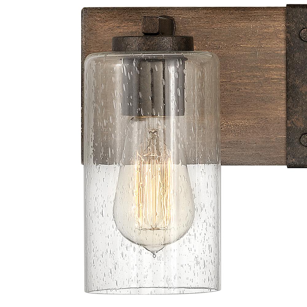 The fresh, rustic design of the Sawyer collection will enhance any living experience with a warm, cozy ambiance. The Aged Zinc finish with Distressed Black accents or Sequoia finish with Iron Rust accents paired with clear seedy glass offer a farmhouse chic style.