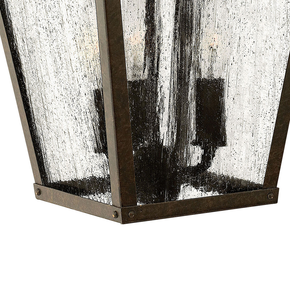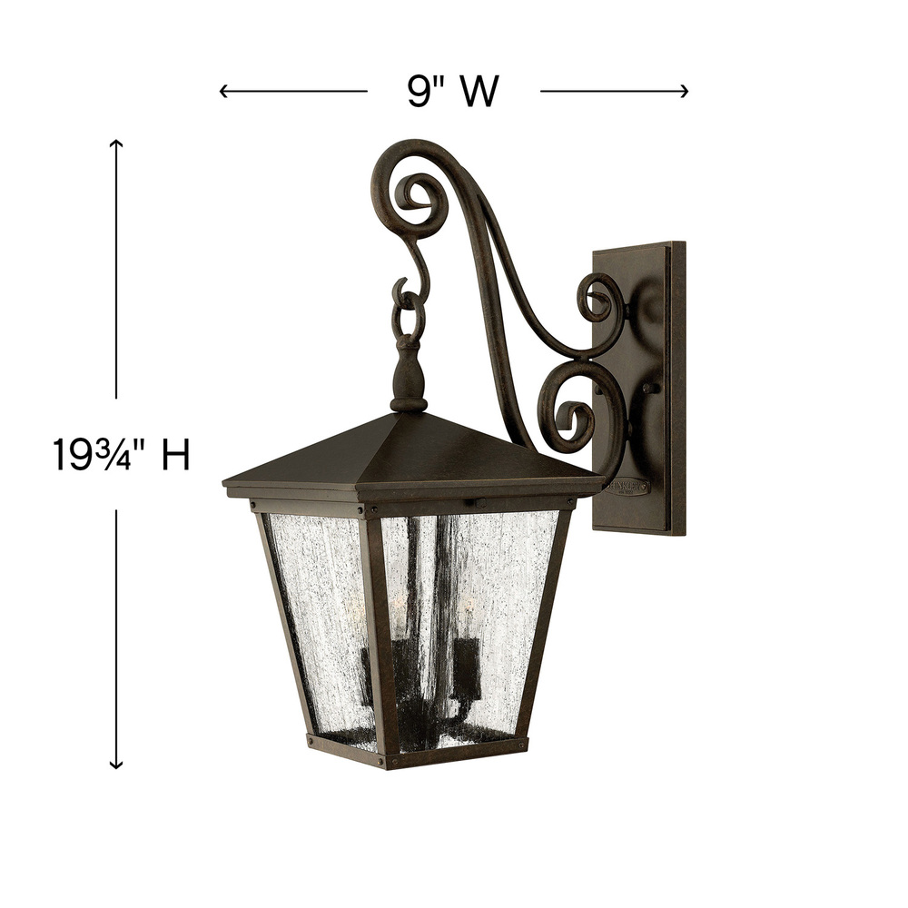 Trellis is a traditional European lantern design in an Aged Zinc finish with clear glass or Regency Bronze with clear seedy glass. The large scroll arm detail, cast loop finial and true rivet detail create a refined elegance.