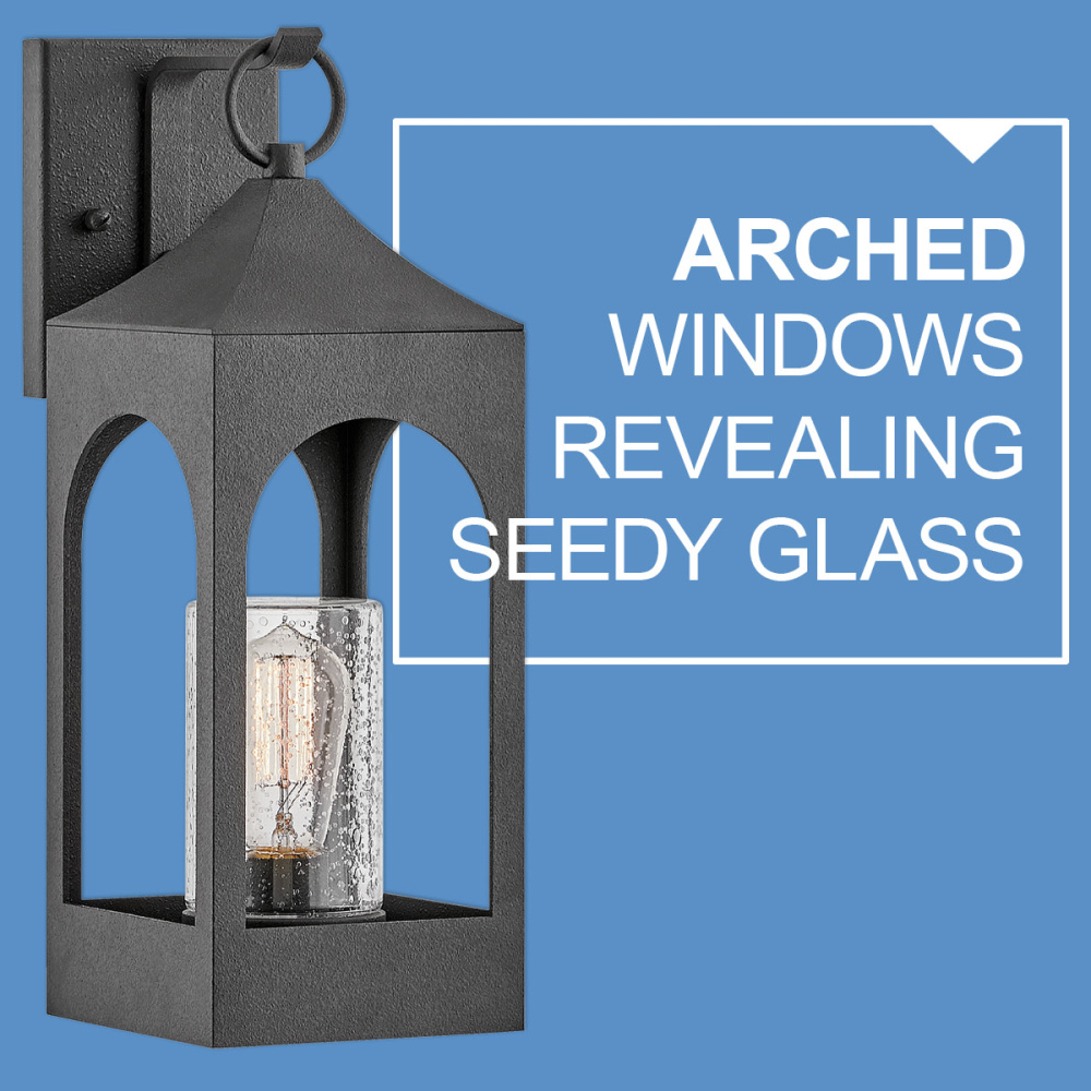 Amina is tradition with a flair. This lantern-inspired design features dramatic, arched windows revealing a seedy glass that creates a faux candle effect. Constructed of durable aluminum in a Distressed Zinc finish, Amina is complete with an oversized loop reinforcing its timeless appeal.