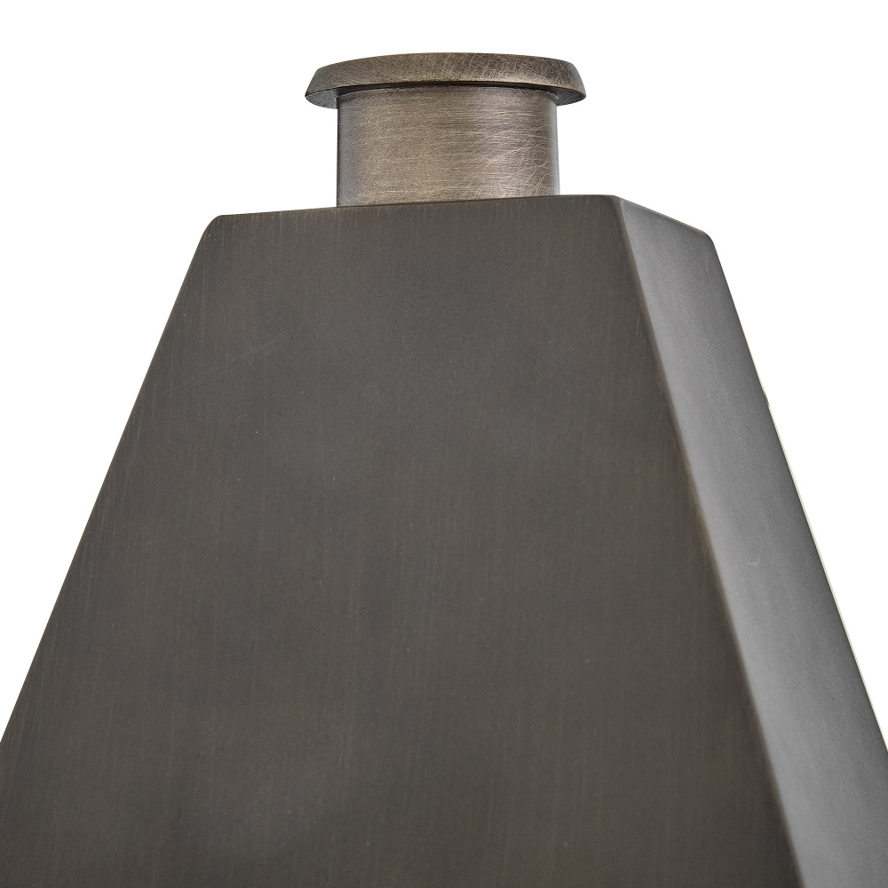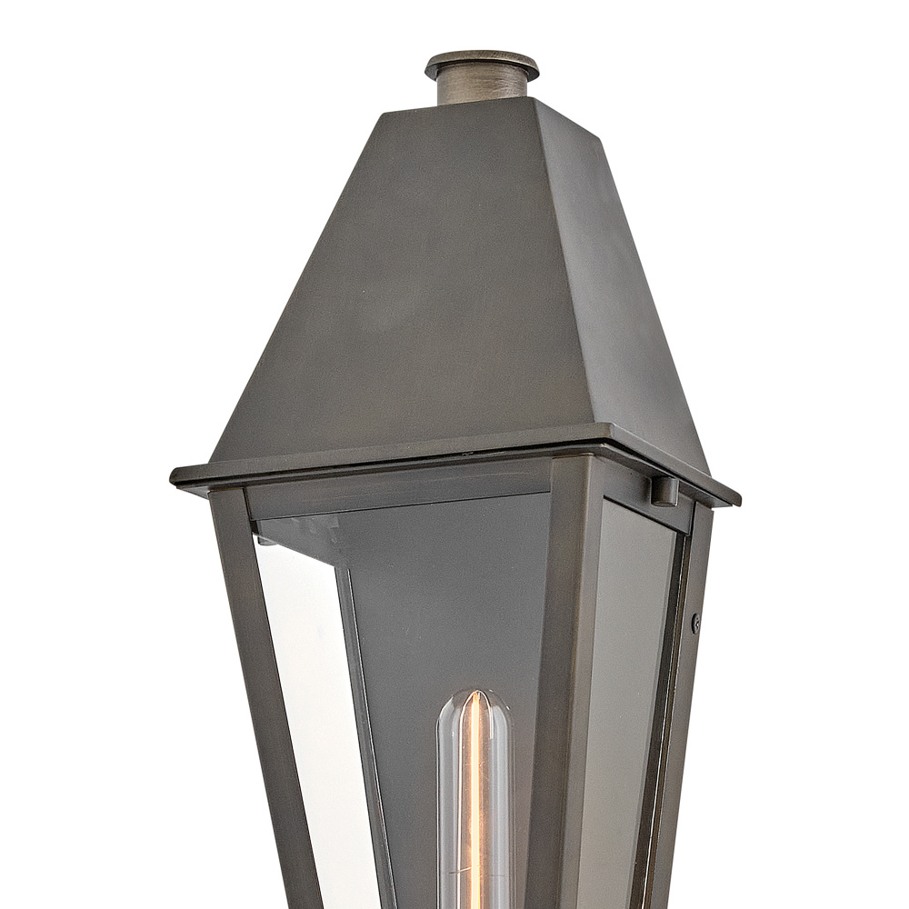 Endsley’s stately, modern gas lantern design features an oversized roof with a simple chimney, complemented by tall, clear glass and a painted, artisanal Blackened Brass finish. Each dignified fixture embraces traditional architectural details yet feels right at home in contemporary outdoor spaces.