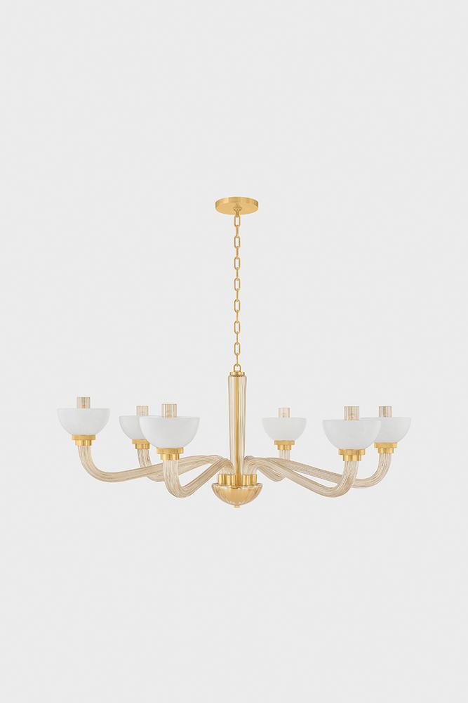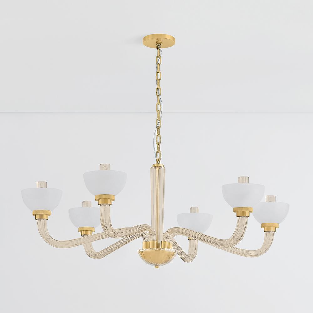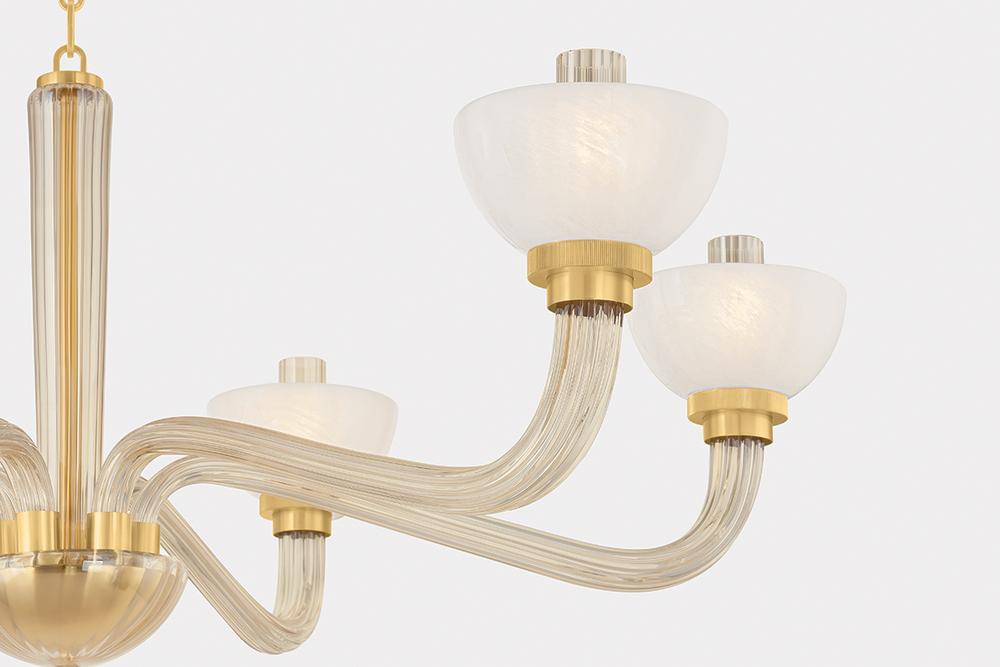 Vintage-inspired shaping, layered glass, and sophisticated finishes elevate the surprising silhouettes of the St. Lawrence family. Offering contemporary interpretations of classic motifs, the fluted champagne glass branches extend into upturned bowl-shaped opal seedy glass shades. Sleek Aged Brass metalwork complements the retro forms. St. Lawrence is available as a 1-light sconce or 6 or 8-light chandelier.