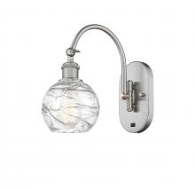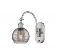 The arm swivels side to side at the base and the solid brass 180 degree adjustable swivel at the top of the socket has internal teeth that lock in at 5 degree intervals and allows for up and down tilting of the shade.