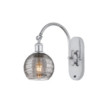 the arm swivels side to side at the base and the solid brass 180 degree adjustable swivel at the top of the socket has internal teeth that lock in at 5 degree intervals and allows for up and down tilting of the shade