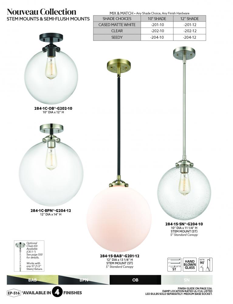 The Nouveau collection is comprised of heavy cast components with engraved lines that give the fixture an art deco look and feel. We offer the fixture in 4 finishes with over 100 possible metal and glass shade options that can change the style to fit any d