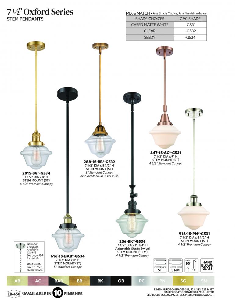 The Edison collection is comprised of heavy cast components that give the fixture a sturdy transitional look. We offer the fixture in 9 finishes with a Bare Bulb look or with over 100 possible metal and glass shade options that can change the style to fit