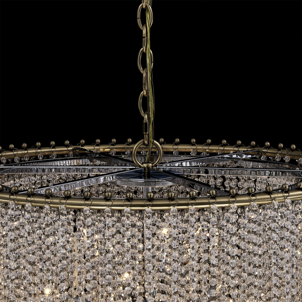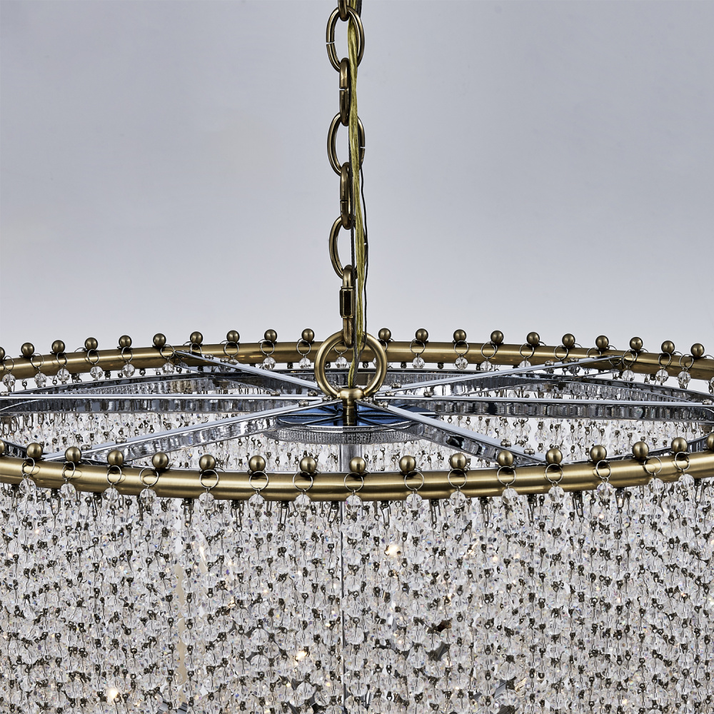 Waterfall crystal drapes over the mainframe is a unique design feature of this wedding cake style crystal chandelier