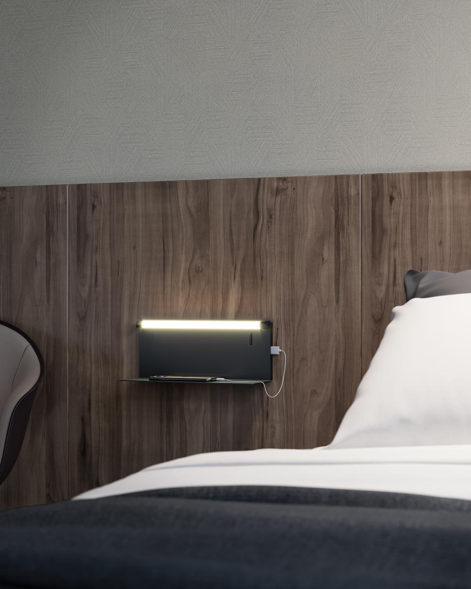 Round puck light with adjustable head, in Black and White finishes. Available with phone shelf and USB charging port.