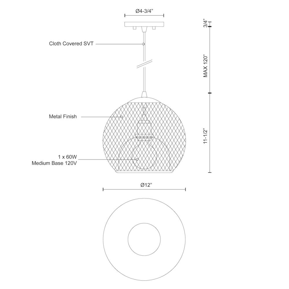 Single lamp pendant with spherical powder-coated wire mesh shade. Color configurations include uniform black or an exterior black mesh with inner gold mesh. Suspended by matching cable. Available in 2 sizes.