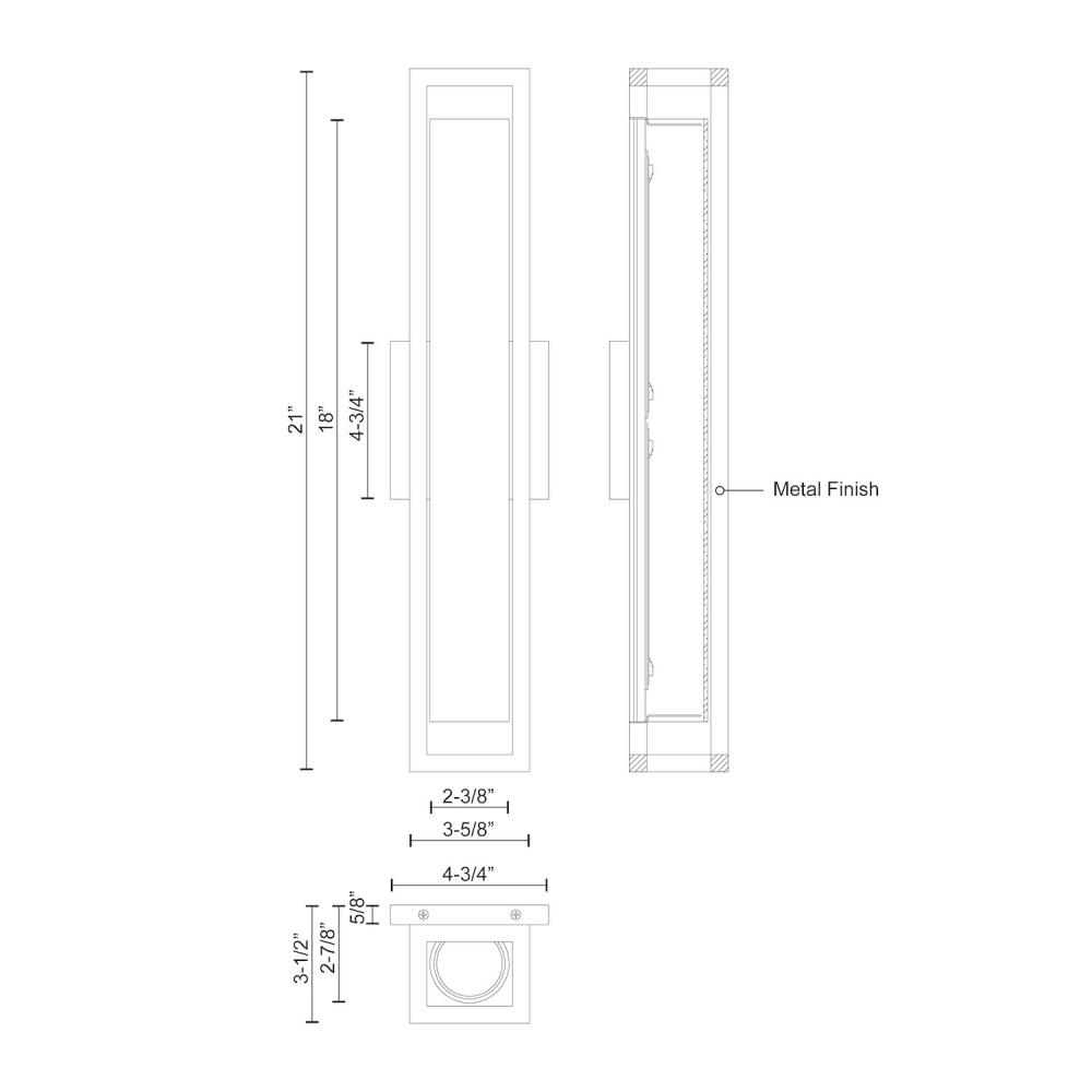 Square powder-coated steel frame. Extruded aluminum heatsink mounted to square wall plate. Cylindrical opal glass diffuser. Outward emitting wall light. Custom options available.