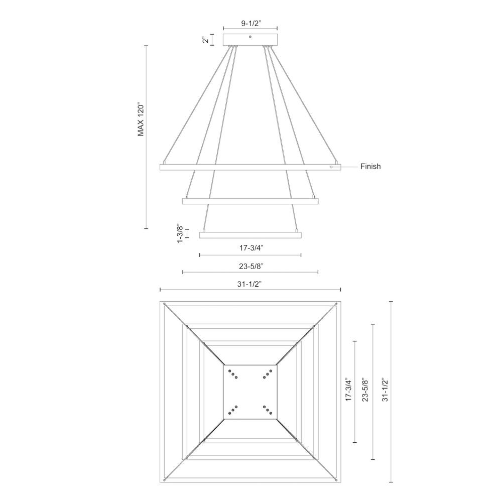 A suspended rectilinear frame emits soft luminance downward from the continuous perimeter opal diffuser. Veiled within the aluminum extrusion is a secondary set of LED lights sending ambient illumination up toward the ceiling. Utilizing a minimal orthogonal outline the PIAZZA series creates an airy effect with the center of the fixture transparent and open. Available as essential singular pendant or dramatic multi-pendant configurations.