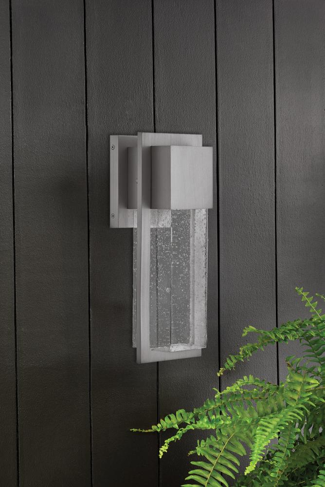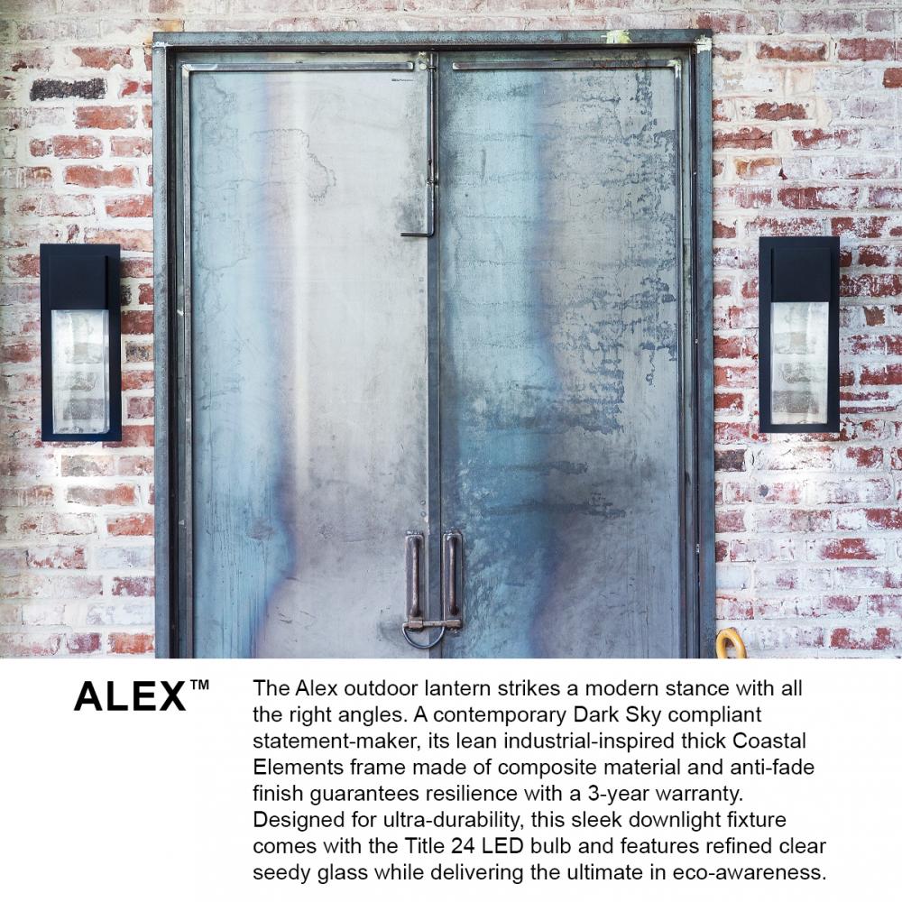 The Alex LED outdoor lantern strikes a modern stance with all the right angles. A contemporary statement-maker, its industrial-inspired thick Coastal Elements frame made of composite material and anti-fade finish guarantees resilience with a 3-year warranty. Designed for ultra-durability, this downlight fixture comes with the LED bulb and is available in versatile Antique Brushed Aluminum or Black finish options. Alex is equally happy indoors, turning heads as an interior wall sconce.