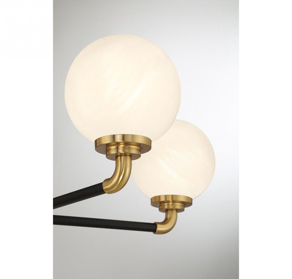 This Dresden 5-light chandelier takes vintage-inspired style to the next level. Its arms, finished in a timeless combination of Matte Black with Warm Brass accents, hold orbs of white strie glass with eye-catching wisps and swirls that add a touch of dimension and intrigue. Dresden is 27" in width and has an adjustable height ranging from 17.5" to 71.5". Comes with four 12" downrods and one 6" downrod. Uses five candelabra size bulbs of up to 60 watts per bulb. Bulbs not included.