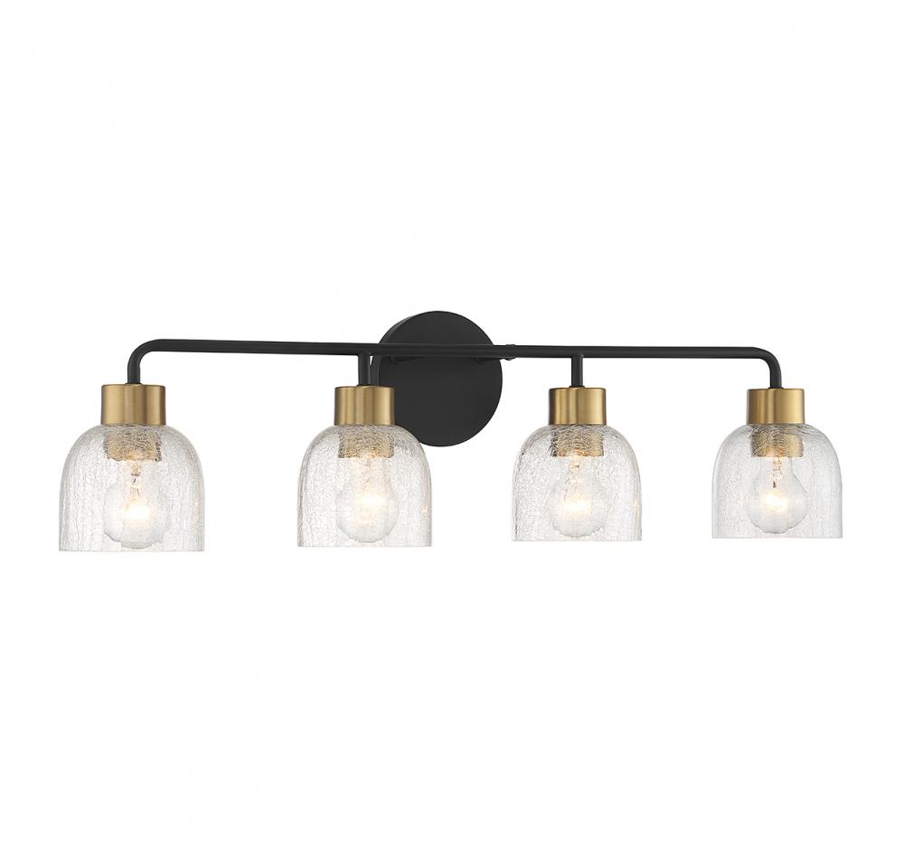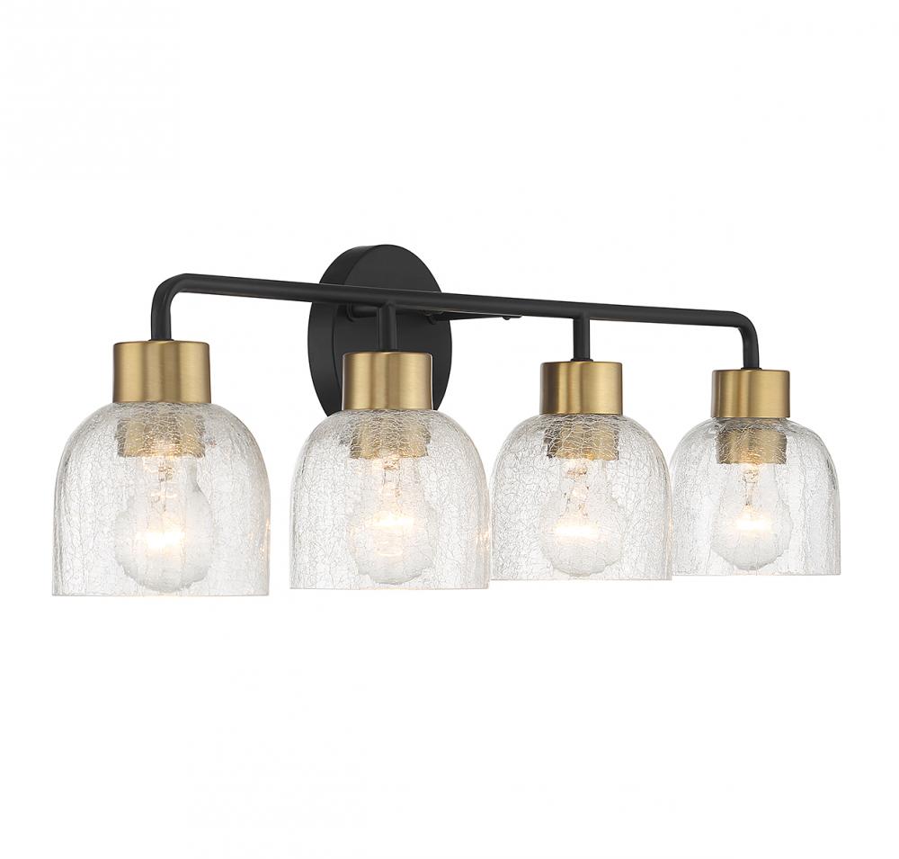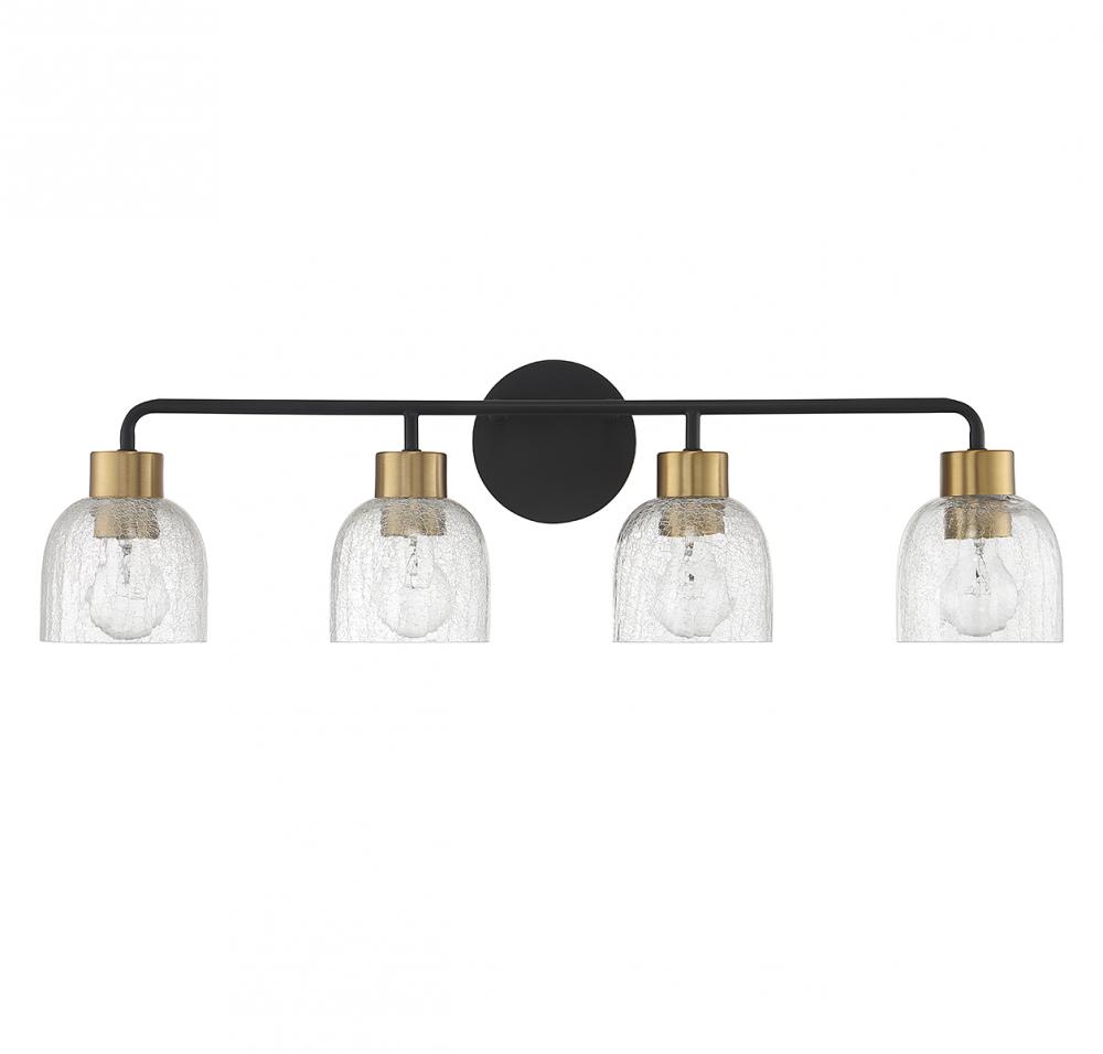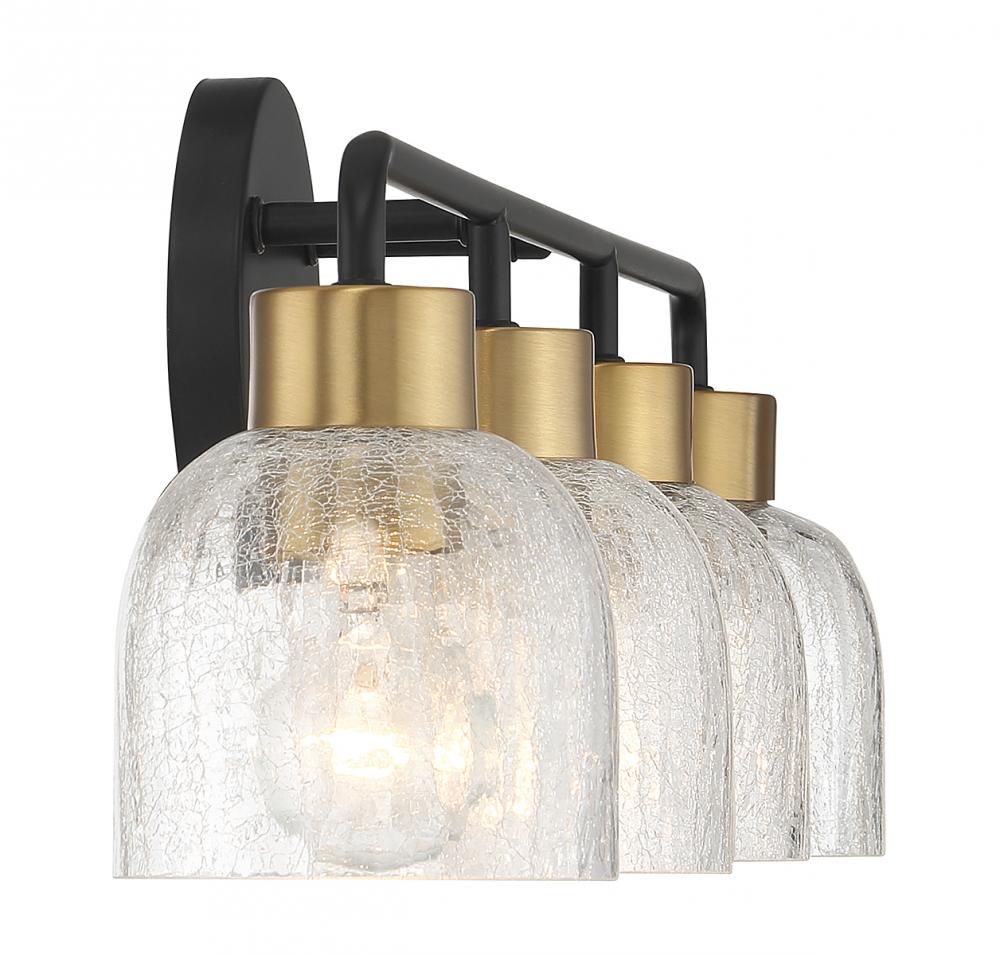Bring an edgy touch to your home with this Flagler 4-light bath vanity light, which flaunts shades of crackled glass for maximum textural intrigue. The black and brass finish adds a touch of two-tone flair on top. Flagler is 8.75" in height, 30" in width and extends 6" from the wall. It uses 4 standard size bulbs of up to 60 watts per bulb (bulbs not included).