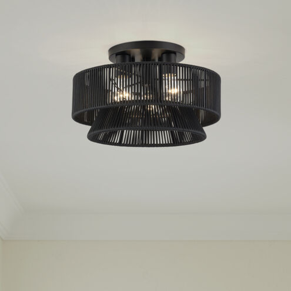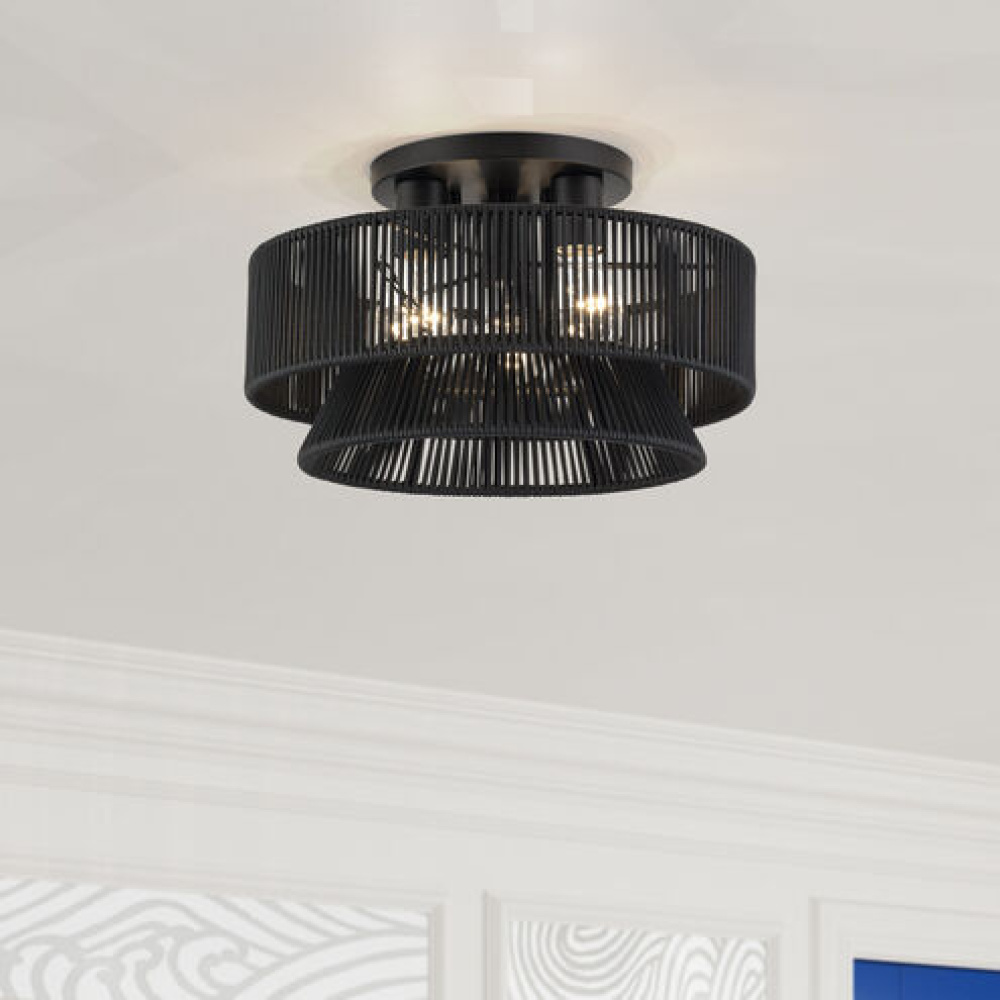 Laidback yet disciplined, the midcentury modern Florell lighting collection celebrates all versions of You: from “beach-haired weekender” to “visionary CEO”. with a vast selection in dramatic colors, this boho-inspired design features minimalist metal frames supporting drum-shaped, tapered and tiered shades – beautifully hand-threaded with sleek (fade- and fray-resistant) polyester rope. Semi-transparent texture allows for creating nuanced shadowing effects.