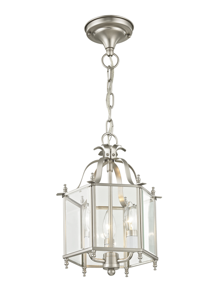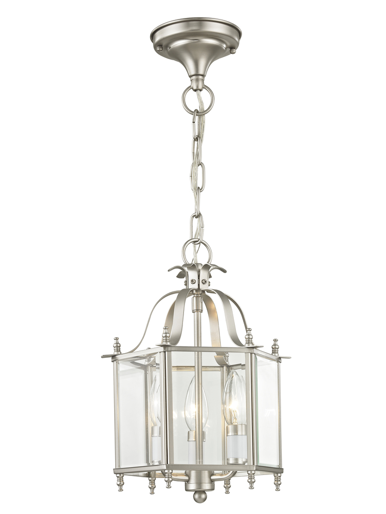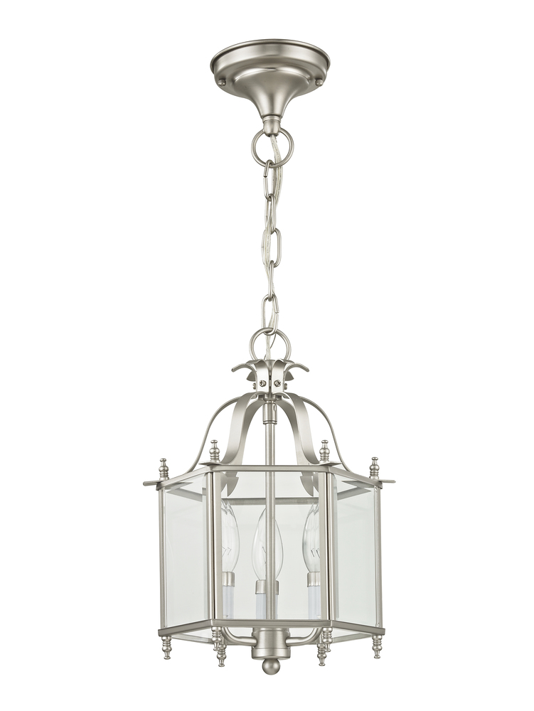 The Livingston Collection Features A Classic Six-Sided Lantern Silhouette. Brushed Nickel Finish With Clear Beveled Glass Gives The Fixture Charming Style And The Candelabra Bulbs Will Fill Your Home With Generous Amounts Of Illumination That Welcomes Your Guests. The Versatile Ixture Can Be Transformed Into Semi-Flush Ceiling Mounts.