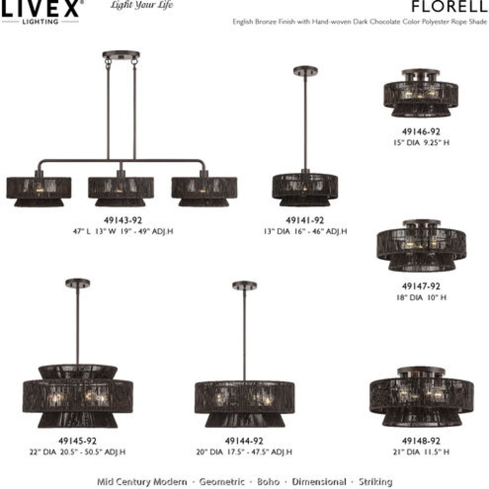 Laidback yet disciplined, the midcentury modern Florell lighting collection celebrates all versions of You: from “beach-haired weekender” to “visionary CEO”. with a vast selection in dramatic colors, this boho-inspired design features minimalist metal frames supporting drum-shaped, tapered and tiered shades – beautifully hand-threaded with sleek (fade- and fray-resistant) polyester rope. Semi-transparent texture allows for creating nuanced shadowing effects.