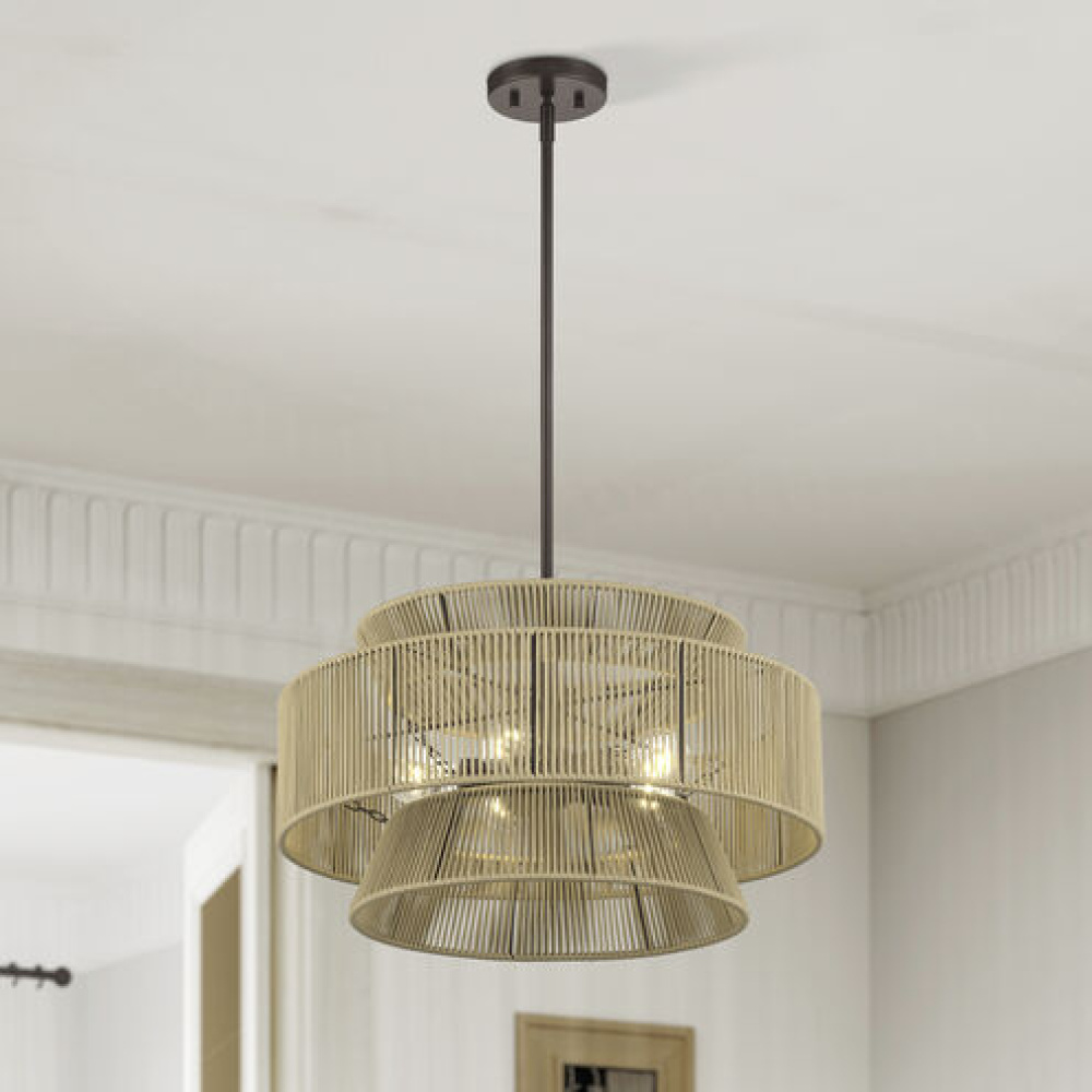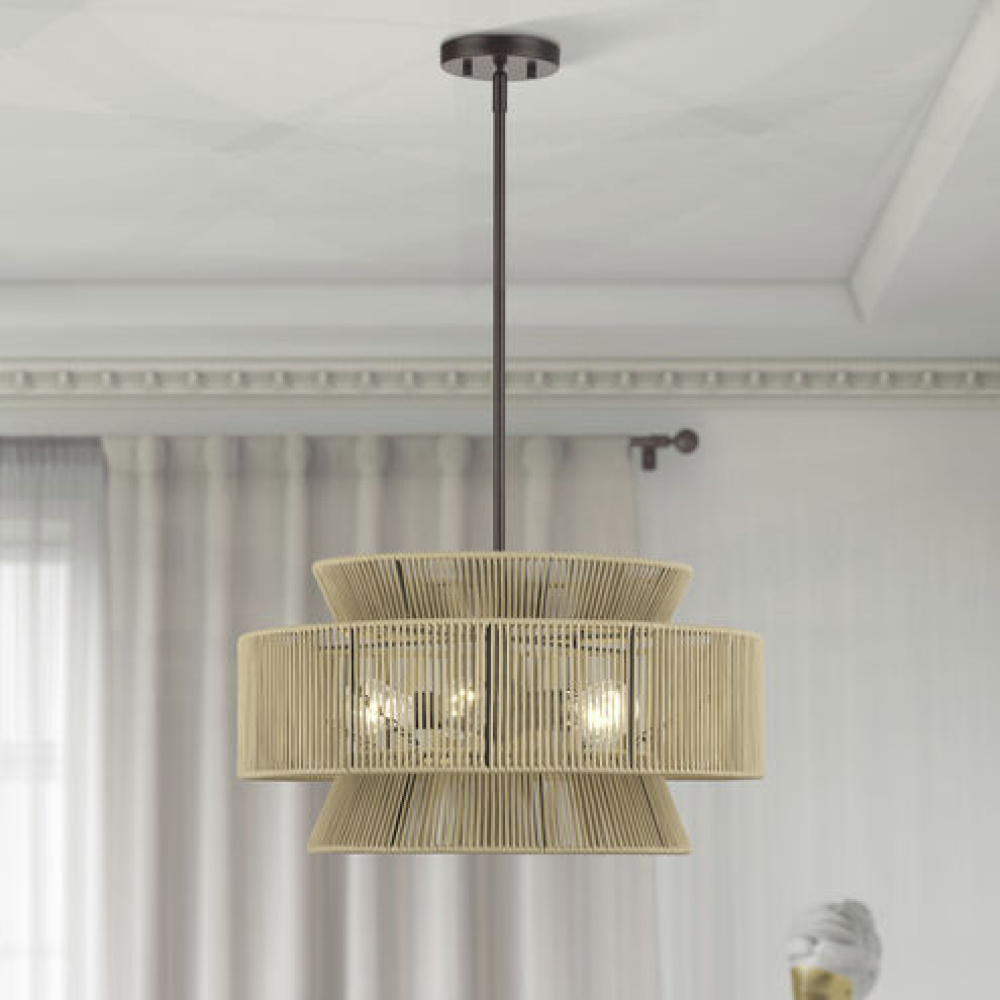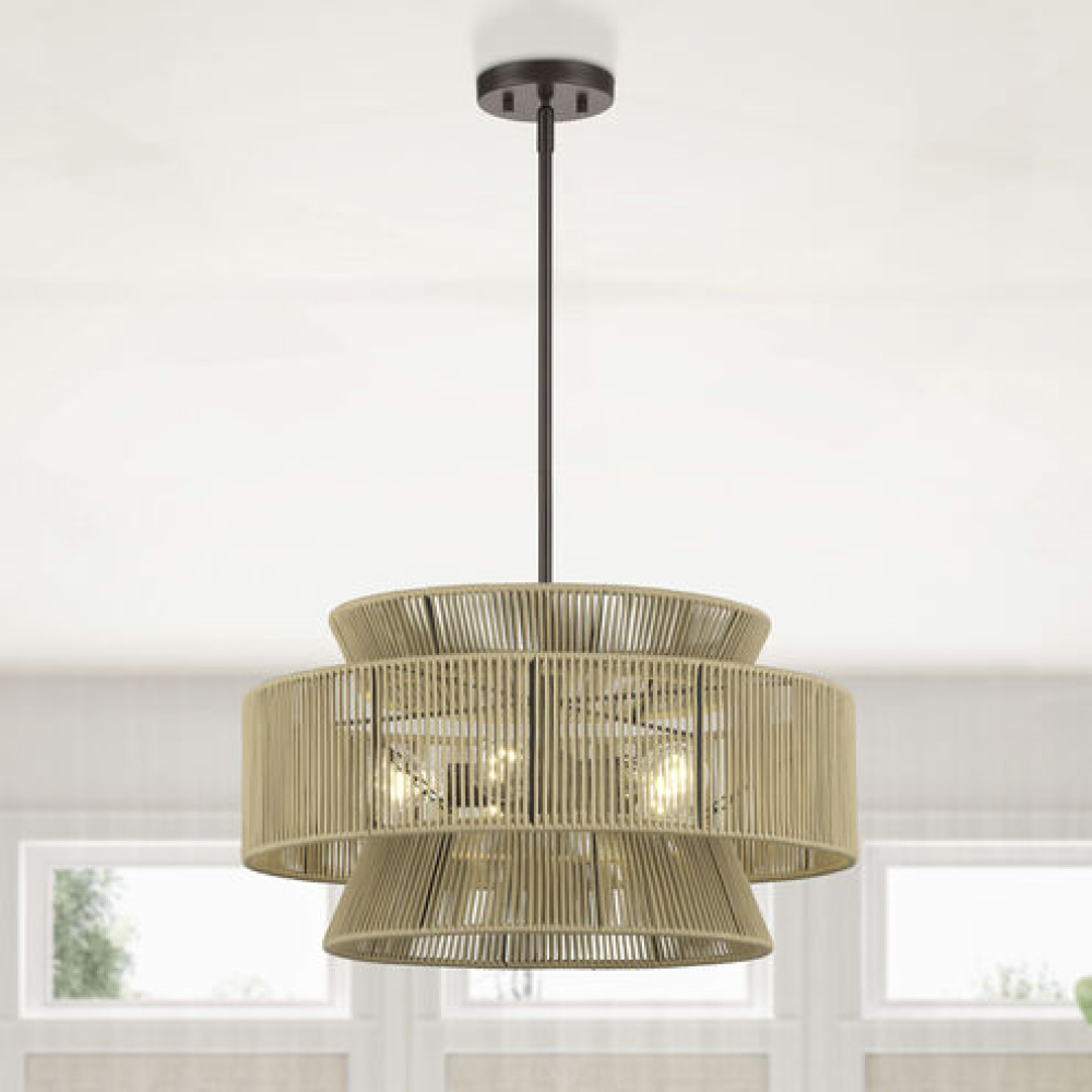 Laidback yet disciplined, the midcentury modern Florell lighting collection celebrates all versions of You: from “beach-haired weekender” to “visionary CEO”. with a vast selection in dramatic colors, this boho-inspired design features minimalist metal frames supporting drum-shaped, tapered and tiered shades – beautifully hand-threaded with sleek (fade- and fray-resistant) polyester rope. Semi-transparent texture allows for creating nuanced shadowing effects.
