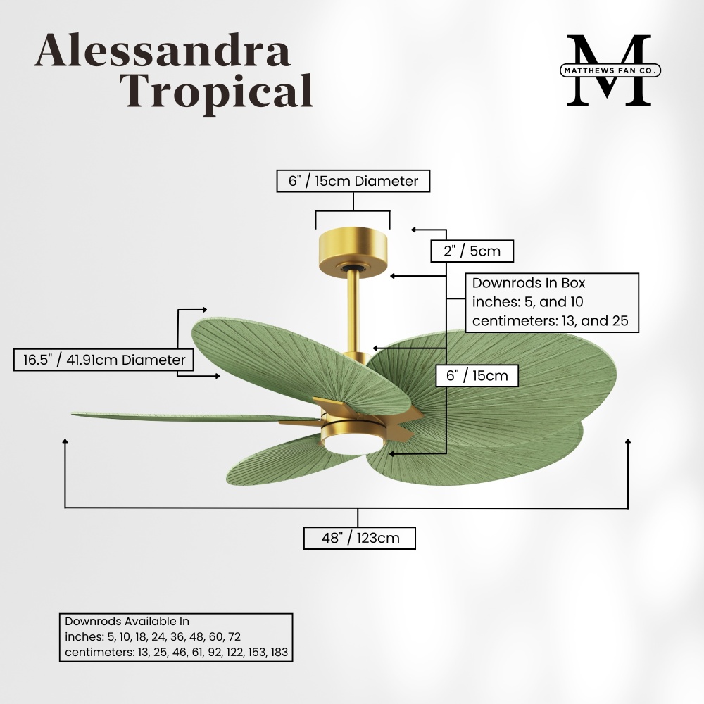 Minimal tropical form with maximum efficiency in 48". The thoughtfully crafted and versatile wet location Alessandra Tropical will complement any aesthetic and improve the health and comfort of any room. Highly customizable, the Alessandra Tropical is available in 5 different body finishes, 11 blade finish options and color changing light kit. Backed by a limited lifetime warranty, our fans are of the highest quality and will dutifully perform for years to come.