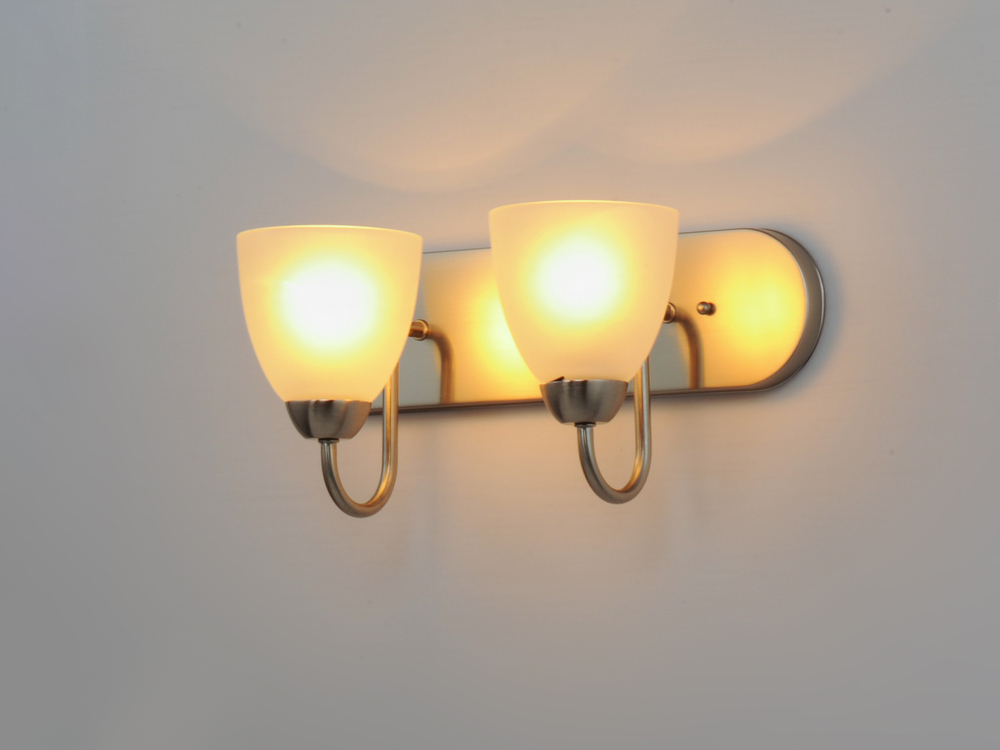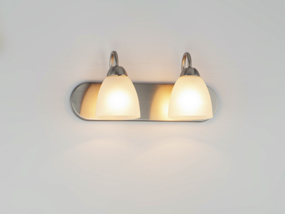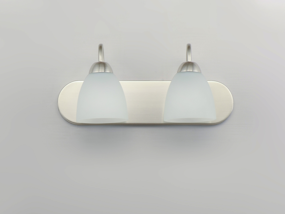 This transitional design works in any style home. Full length oval backplates support simple bell-shaped, Frosted glass shades. Available in Satin Nickel, Matte Black, and Polished Chrome.