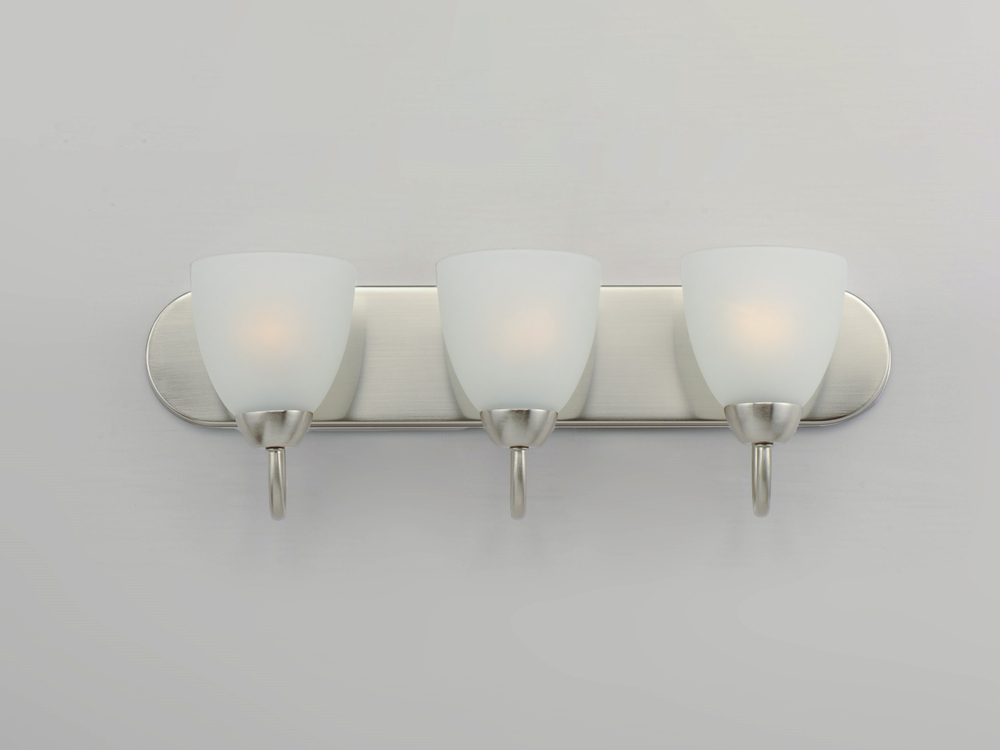 This transitional design works in any style home. Full length oval backplates support simple bell-shaped, Frosted glass shades. Available in Satin Nickel, Matte Black, and Polished Chrome.