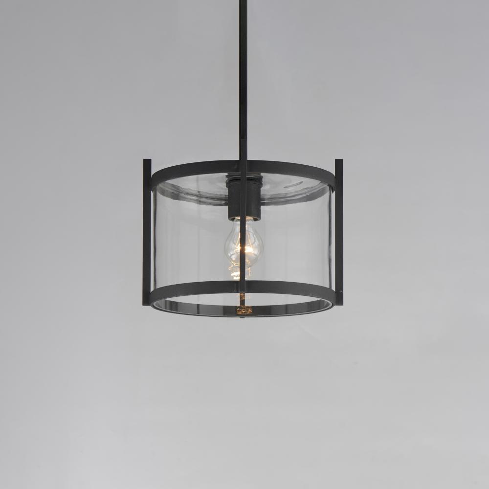 Squared columns in Matte Black finish tower above the cylindrical glass shade rated for outdoor applications. Available in a more modern clear glass option or hammered glass. A rectangular hook detail carries the square form through to the backplate. A mod